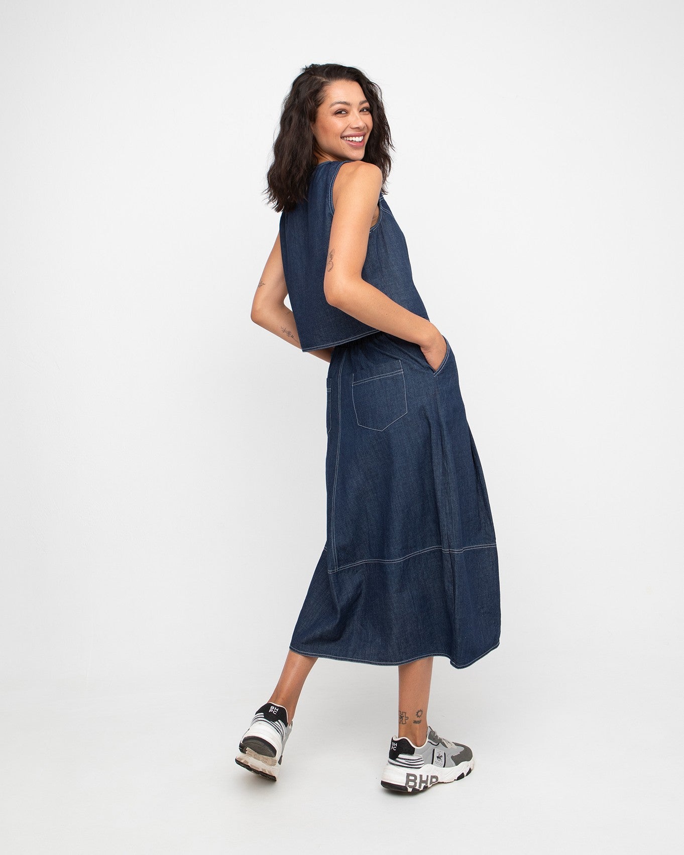 A cropped denim vest with a clean straight fit and sharp contrast seaming that defines the shape. The high arm opening and full zip front give it a utilitarian edge, while the lightweight cotton keeps the feel easy and wearable. Layer it over dresses, shirts, or tees for a crisp finish with modern proportion.