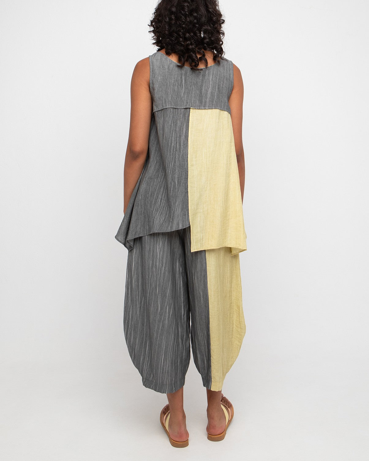 This reversible tank combines ease and versatility with a generous A-line shape and airy drape. A wide neckline and asymmetrical hem create visual flow, while the front-to-back reversible design delivers styling flexibility. Finished in a softly washed woven blend that feels cool against the skin.