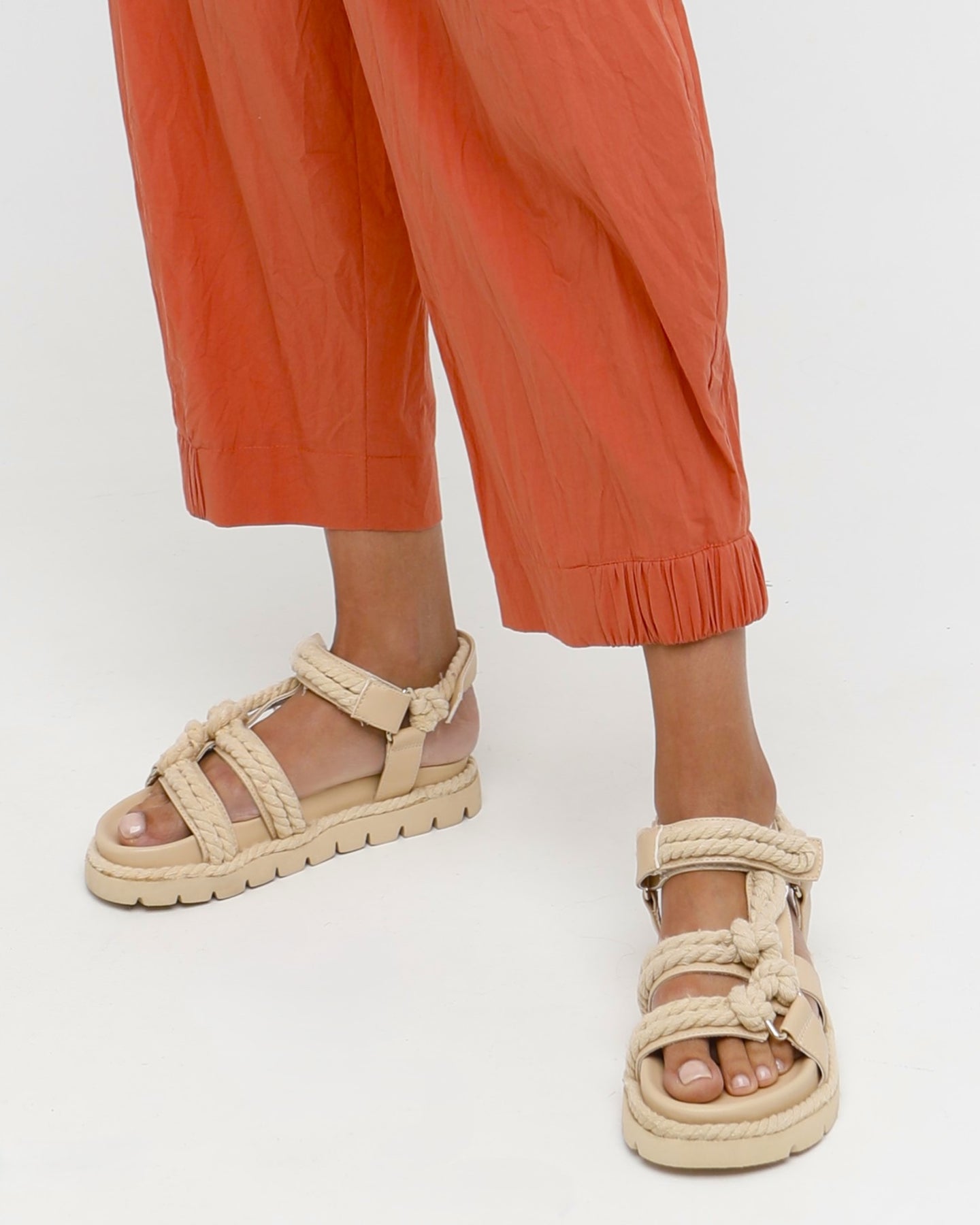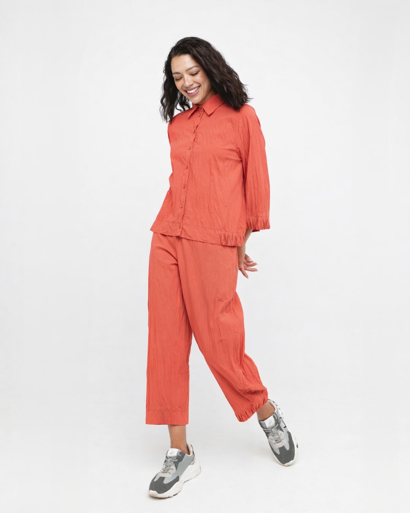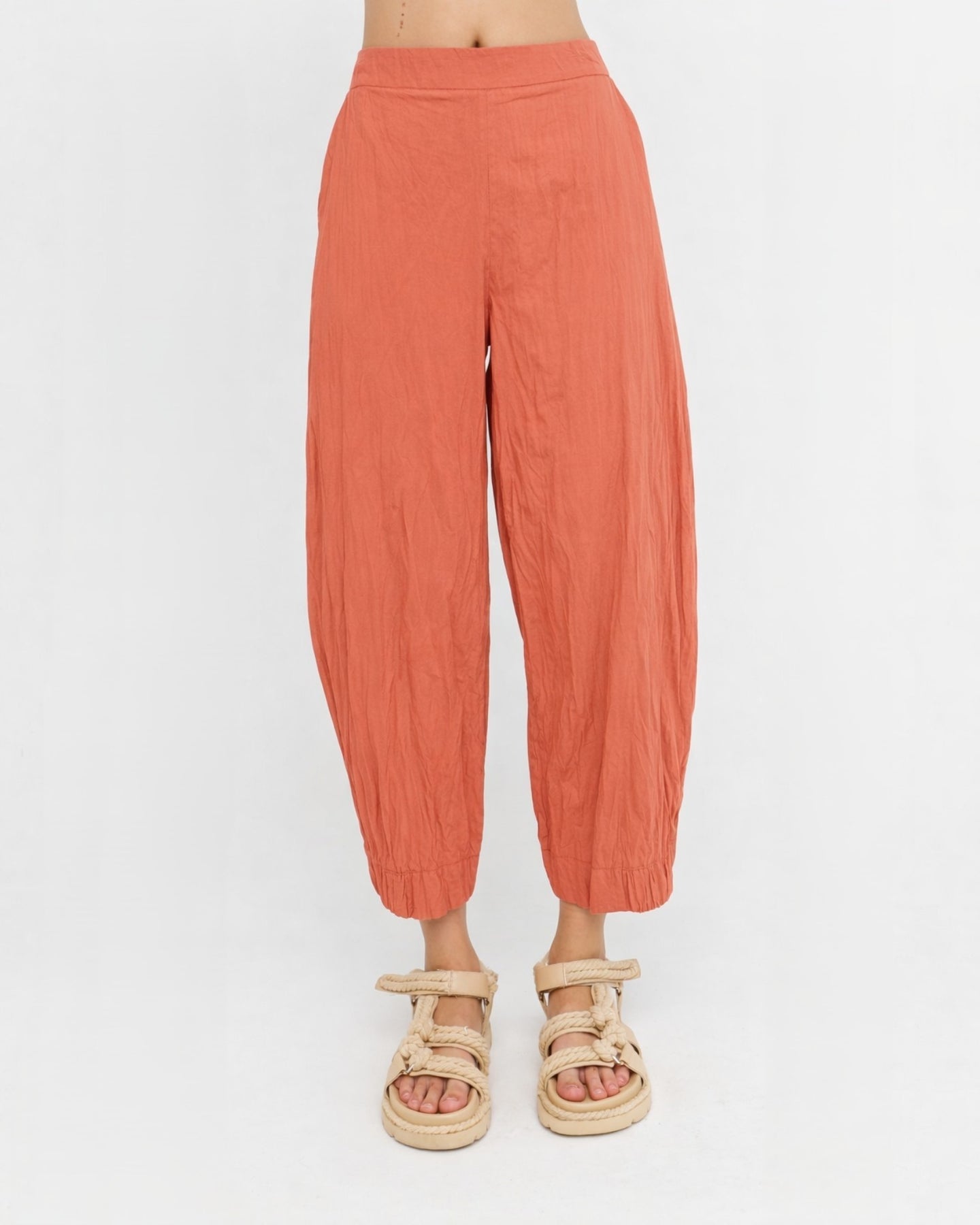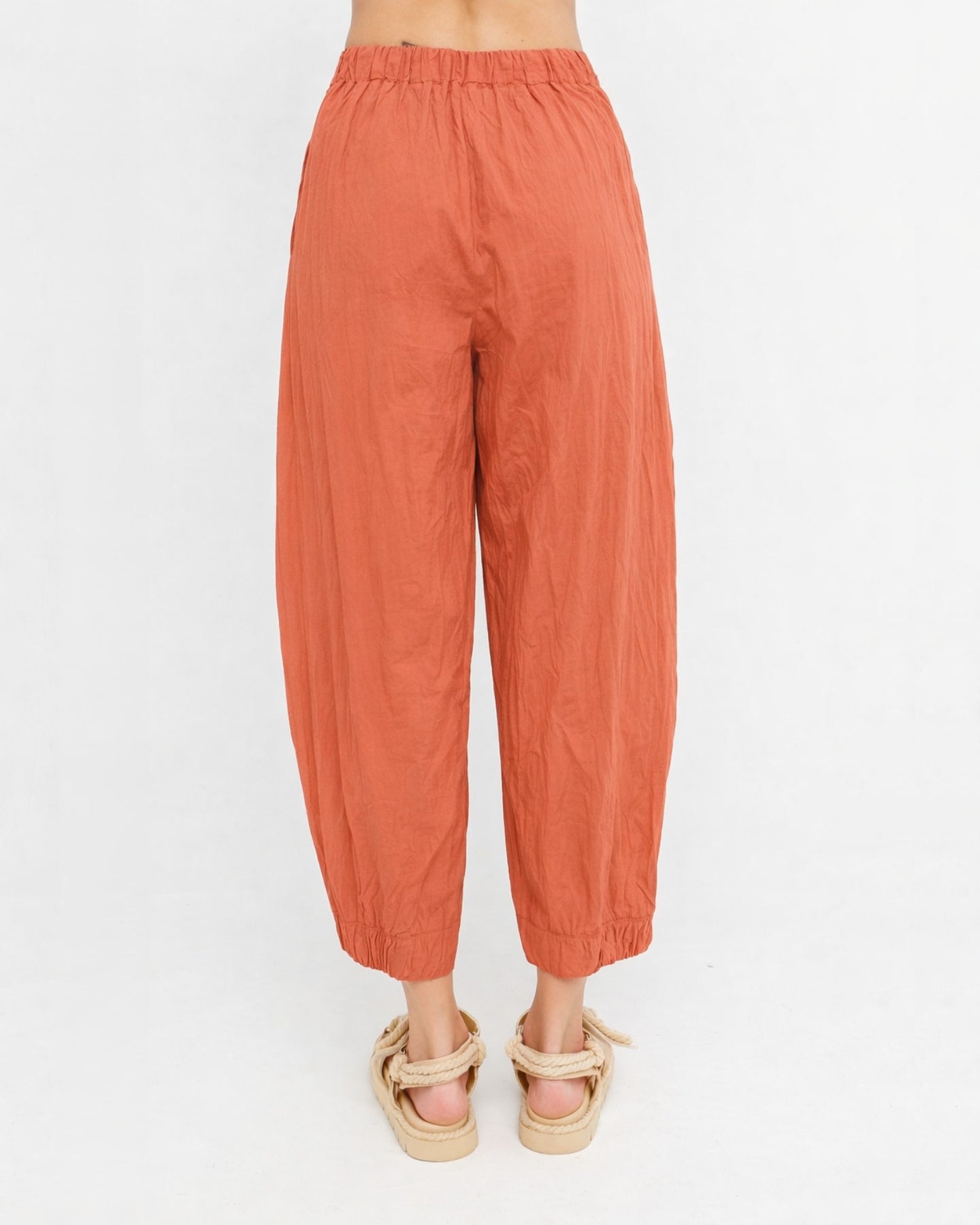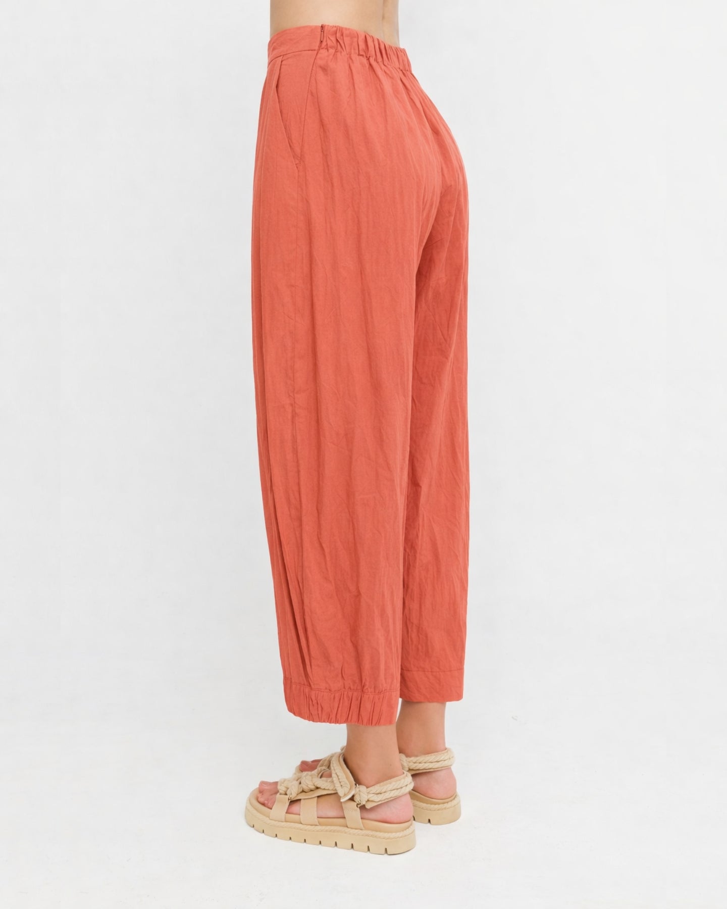 A cropped cotton pant with an easy fit and a gentle taper that gives it a cleaner trouser line. The crinkled percale adds texture and lightness, while the elasticized hem subtly shapes the leg. Finished with side pockets and an elastic back waist, it offers a relaxed feel with a crisp, modern edge.