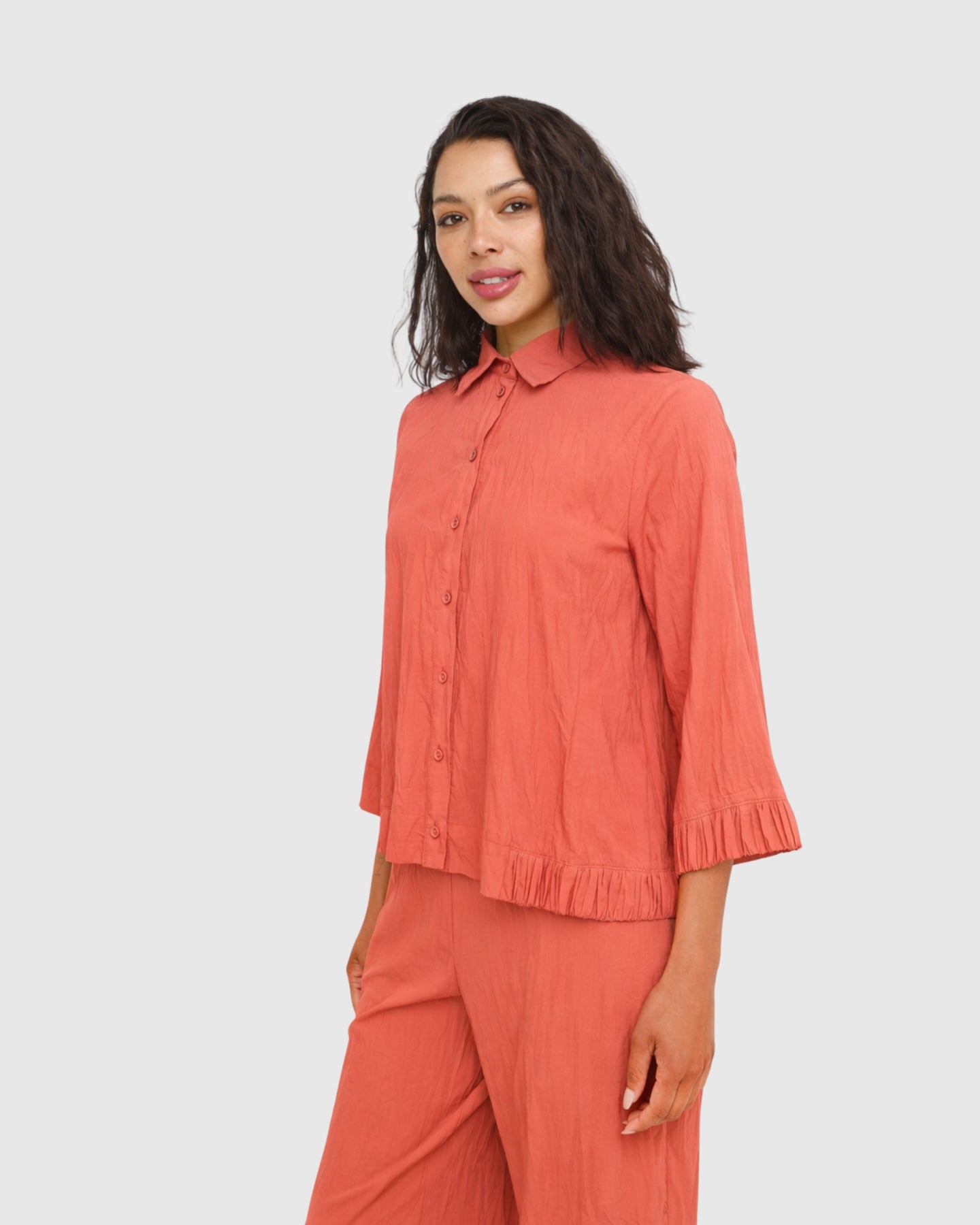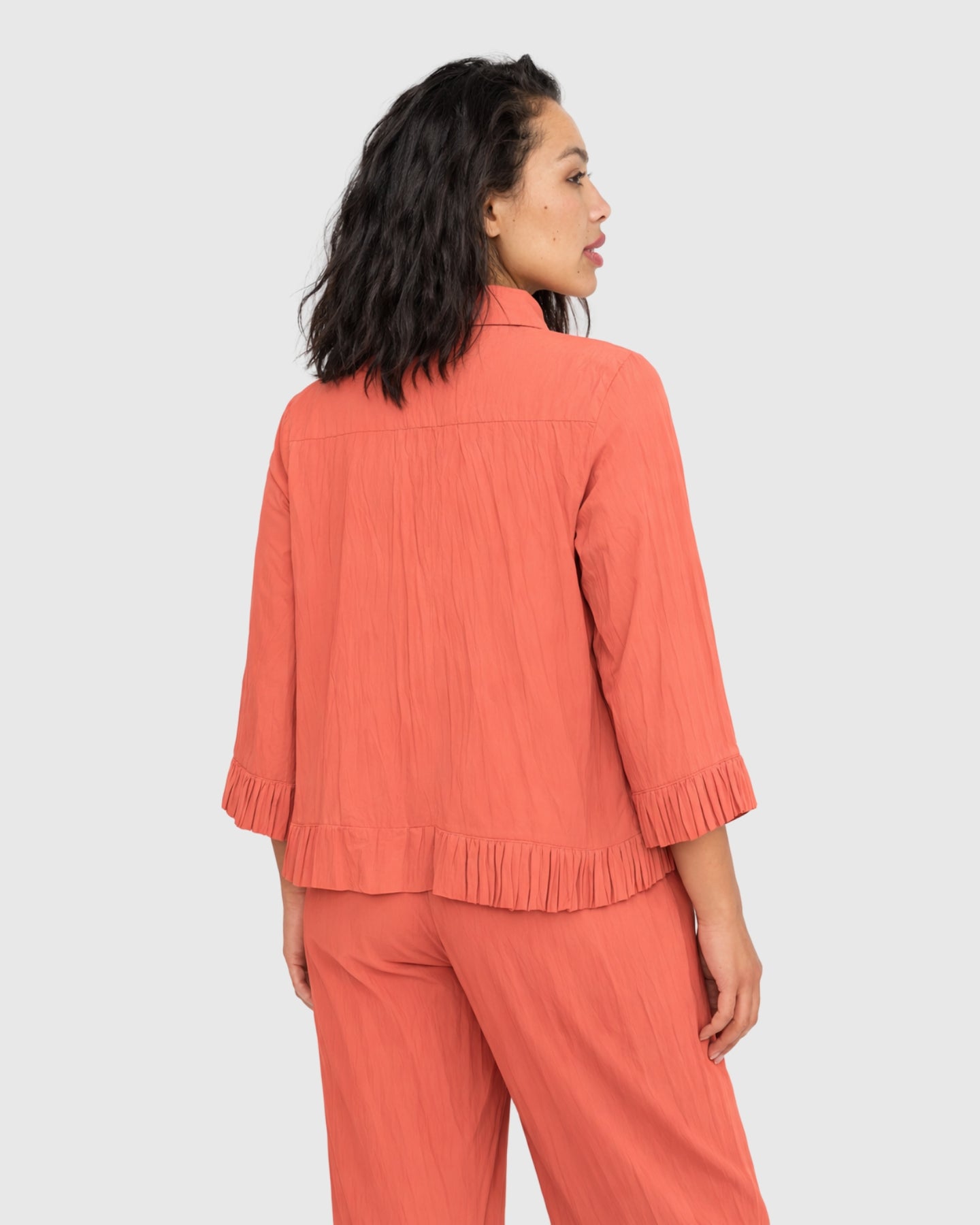 A boxy jacket in crinkled cotton percale with a washed finish that gives it light texture and a relaxed, airy feel. Elasticized ruching at the cuffs and hem adds soft shape, while the button front and foldover collar keep the look grounded. It is an easy layering piece with practical ease and a crisp, modern line.