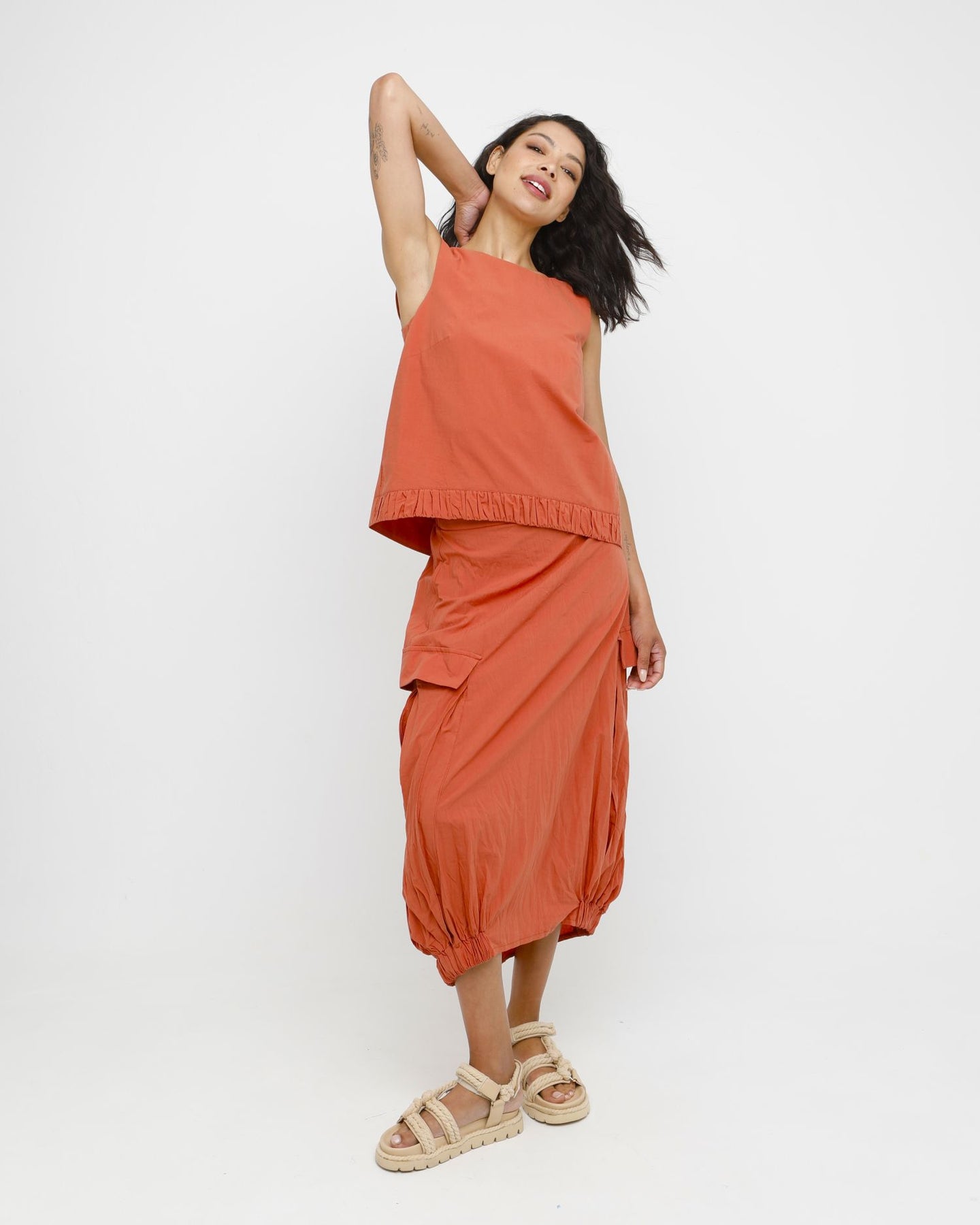 A cargo-inspired midi skirt with a relaxed cocoon shape and a softly crinkled finish that gives it texture and movement. Patch pockets and an elasticated hem add a practical, modern note, while the side zip and elastic back waist keep the fit easy. The washed cotton percale feels light, breathable, and distinctively tactile.