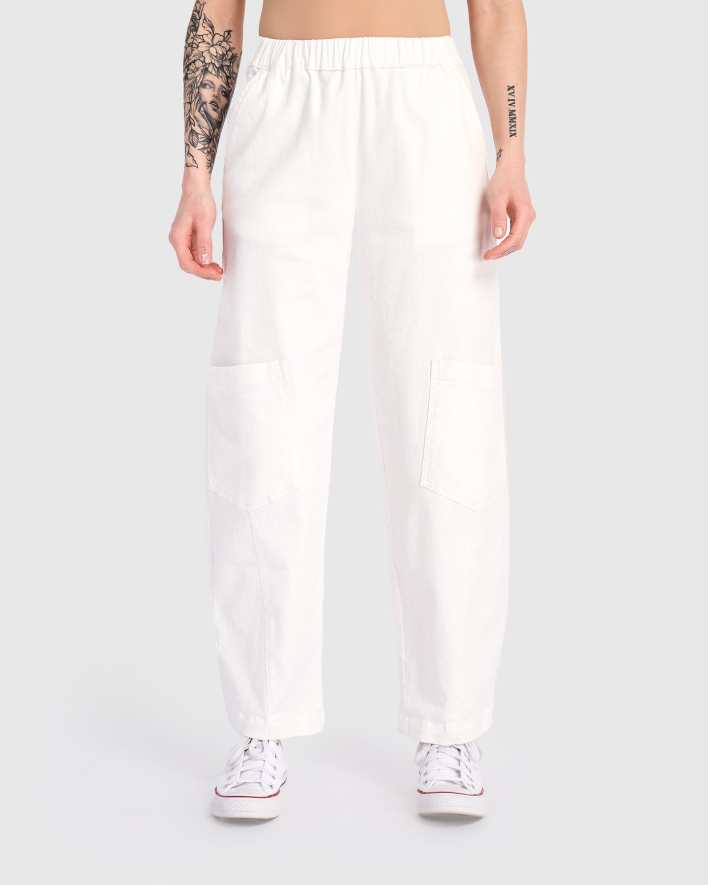A fresh, clean take on a relaxed silhouette, these full-length white pants combine a high-rise stretch waistband with softly tapered barrel legs. Thoughtful seaming and patch pockets at the knees add subtle dimension. Lightweight stretch twill ensures breathable comfort from morning to night.