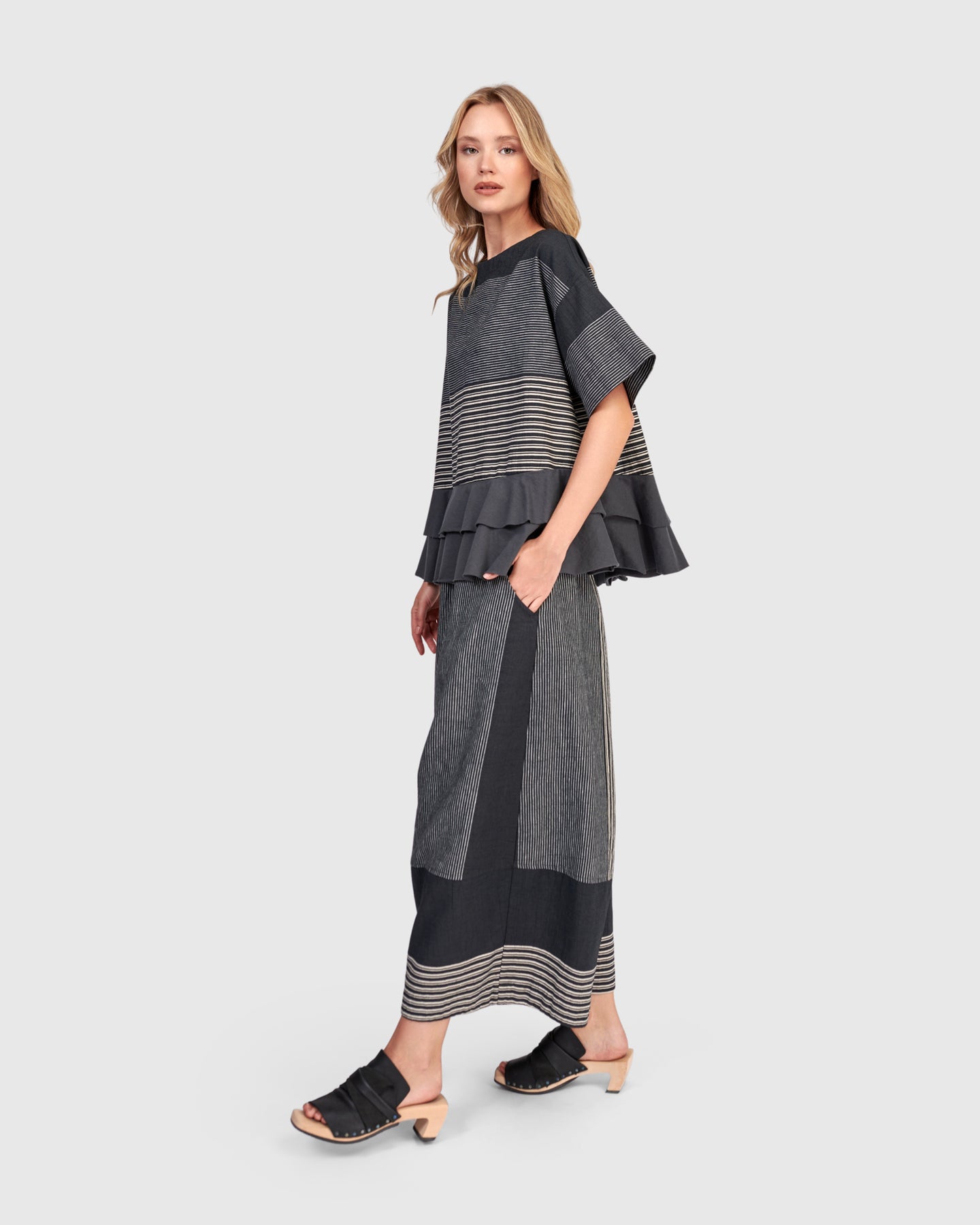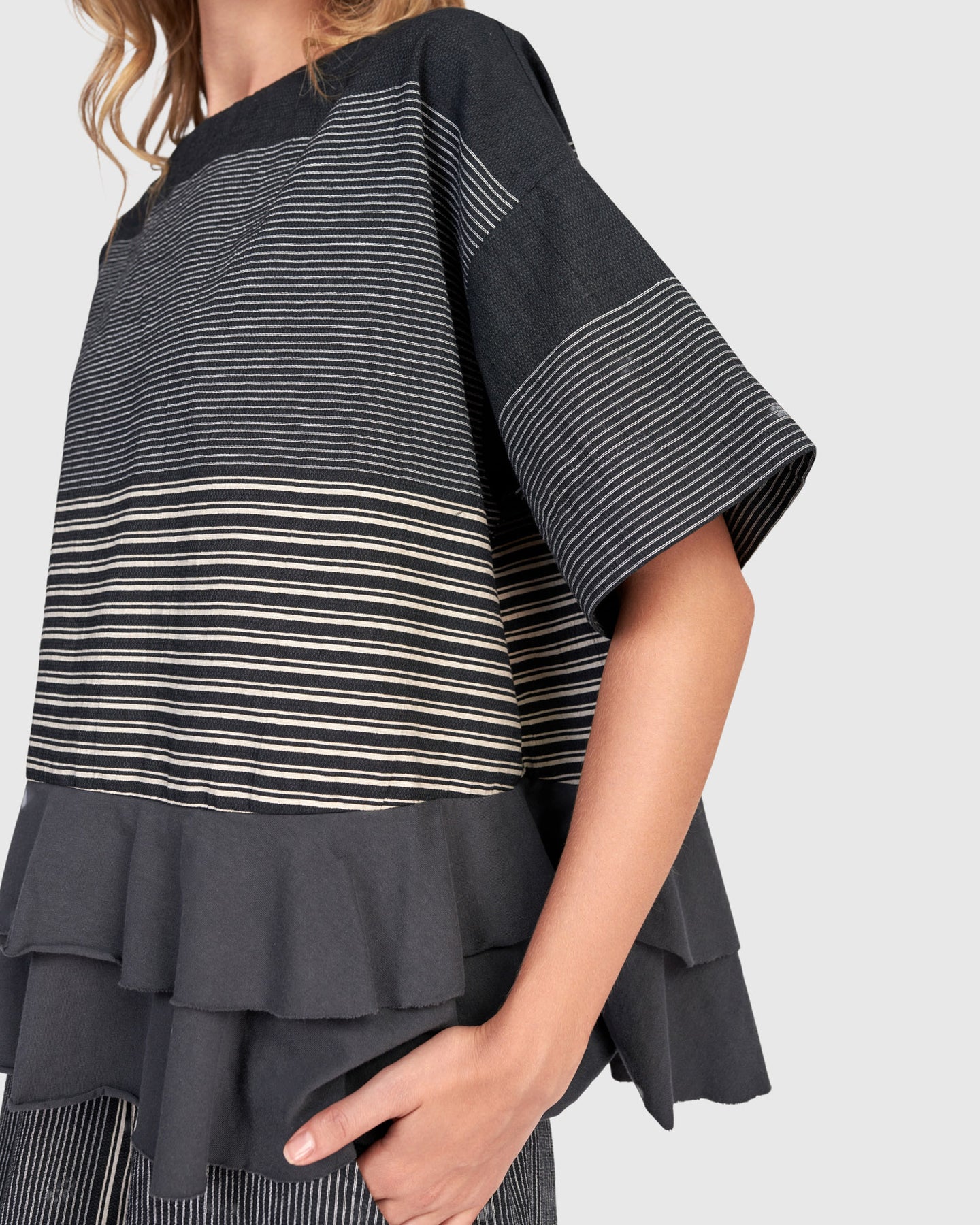 This striped woven top is light and airy with an intentionally loose shape that moves easily on the body. Tiered flounces with raw edges add texture and soft volume, balancing the clean boat neckline. The breathable fabric blend feels cool and relaxed, making it an easy warm-weather piece with subtle drama.