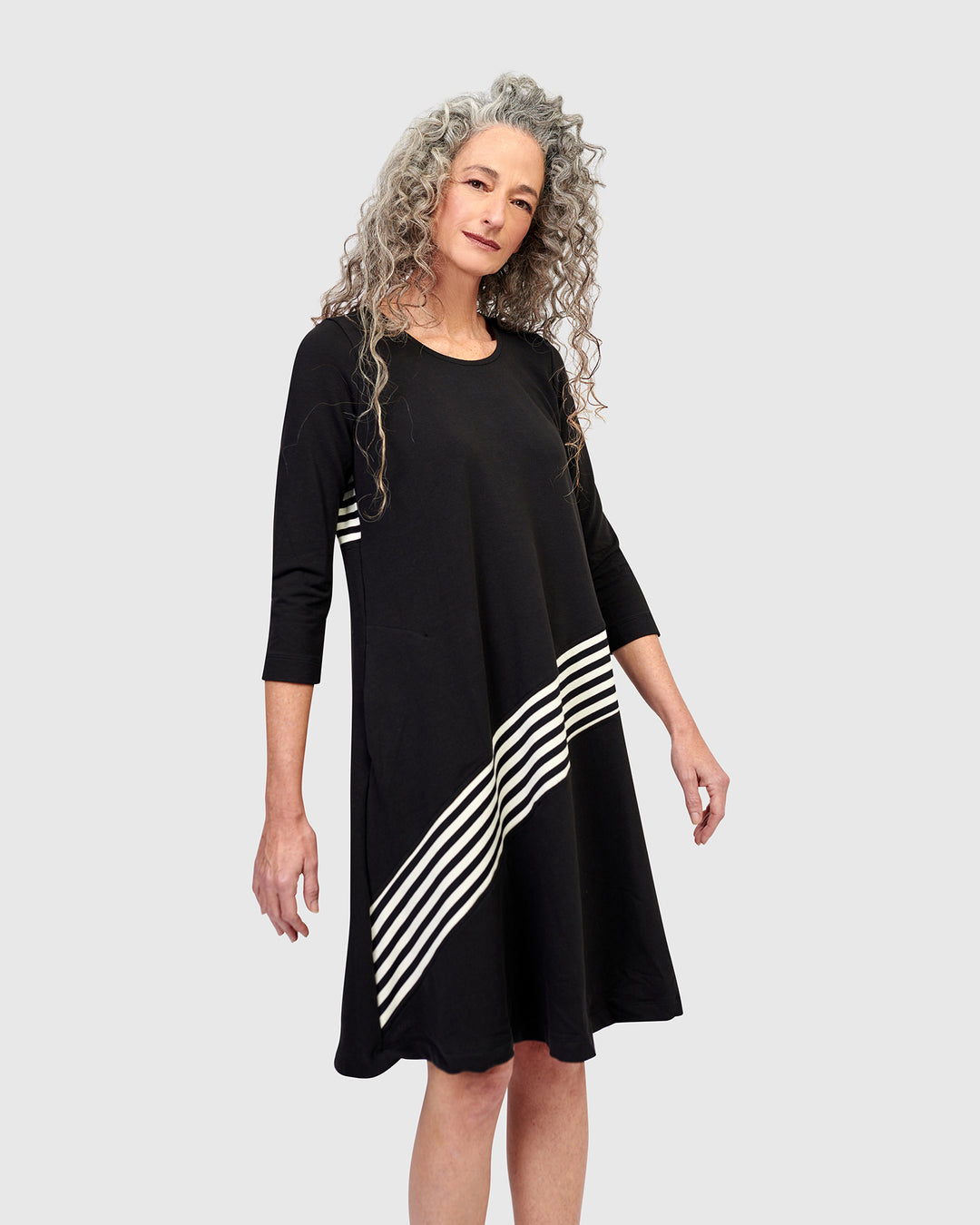 This pullover midi dress is made in a soft jersey knit with tiers of denim and cotton poplin. It has a crew neck, elbow length sleeves, and side pockets. The relaxed fit and A-line silhouette make this an easy dress for everyday wear.