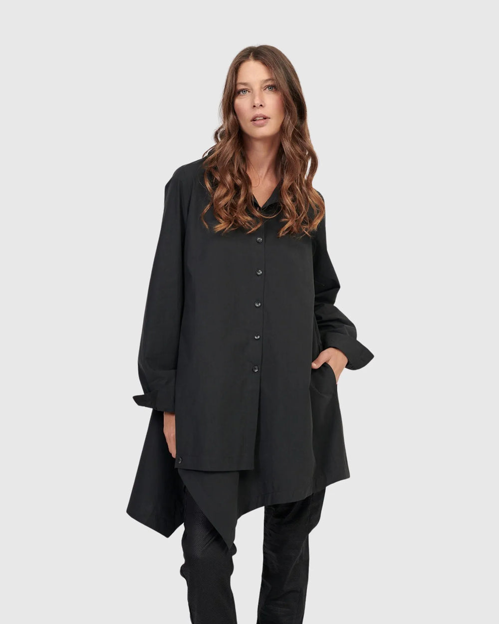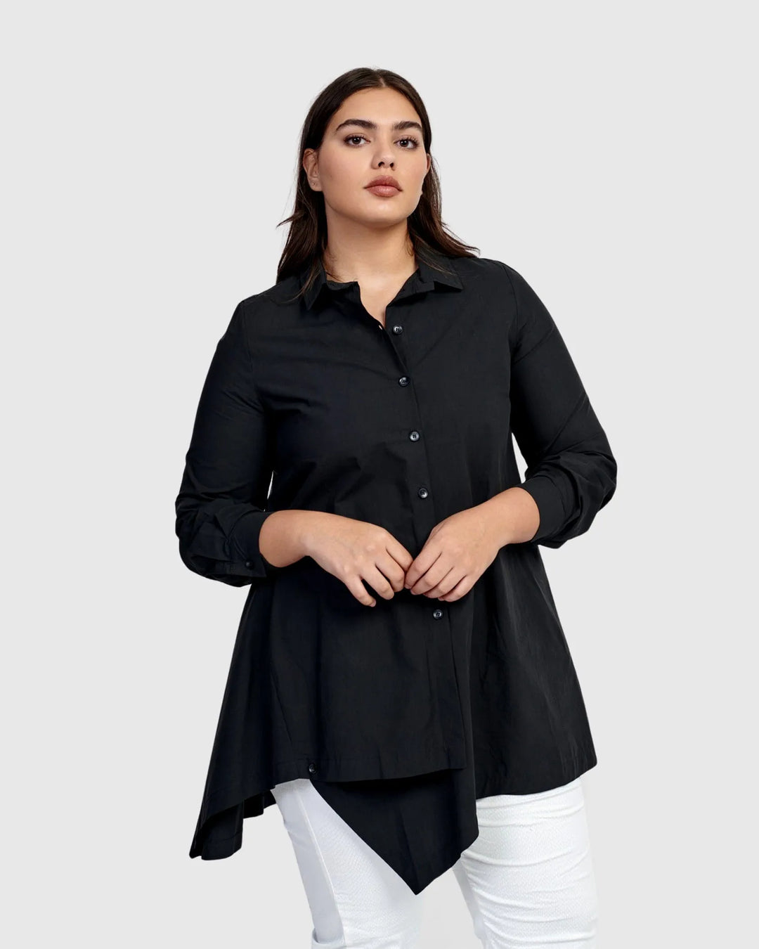 This classic button down shirt has a Mandarin collar, full button placket with front pocket, three-quarter length sleeves and hits just at the hip with side slits. The slim, straight silhouette refines your shape, while the lightweight denim fabric gives off a rustic, workwear vibe.