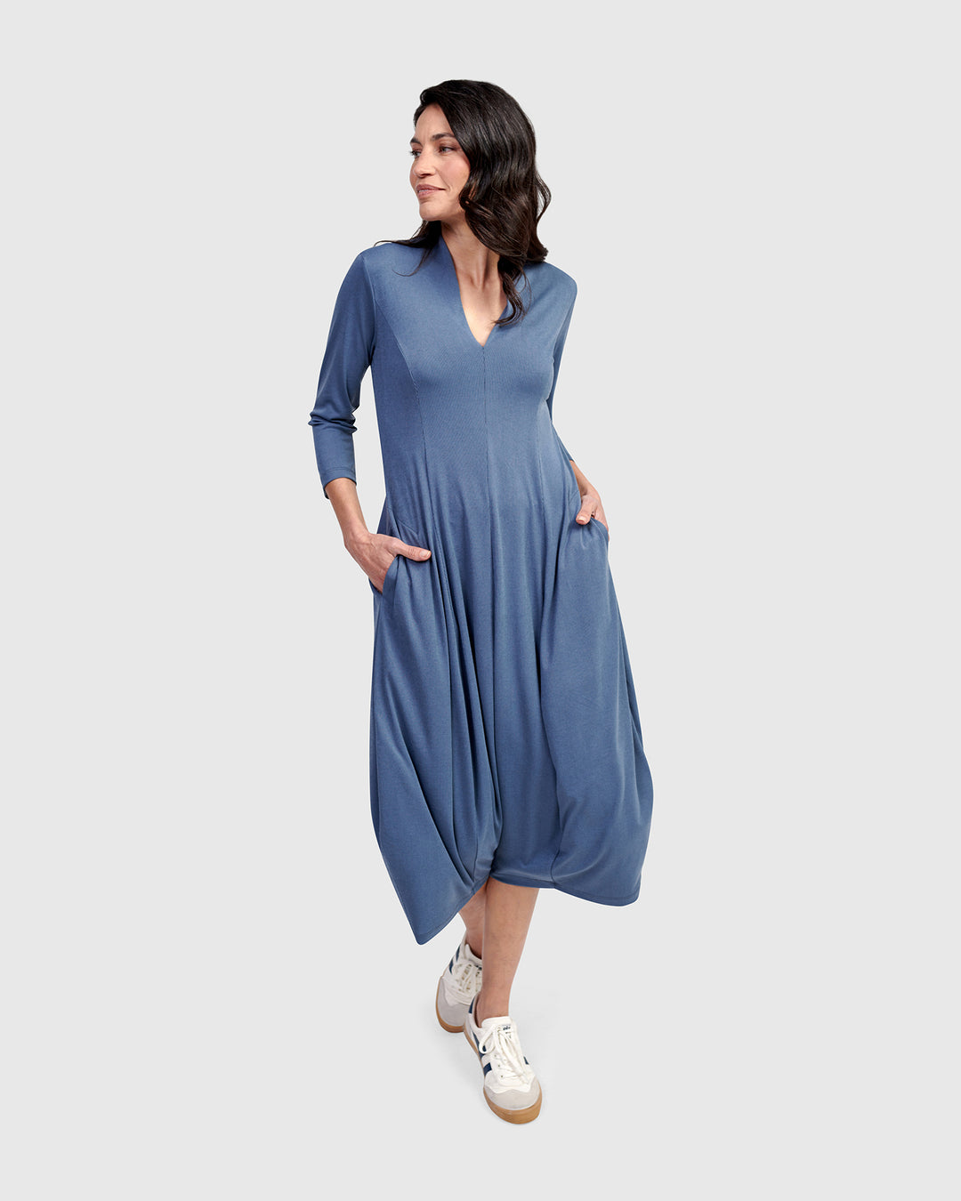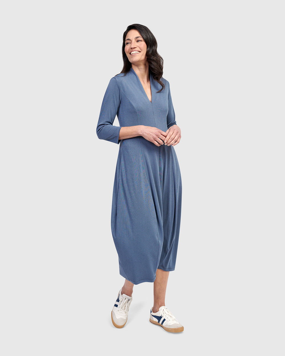 Our most clever interpretation of a shirt dress marries a sense of whimsy with practicality–The Wonderful Dress in navy with fun contrast color striped sleeves. It has a Mandarin collar with a half-button placket (plus a splash of bold red on the lining), a draped front pocket, and relaxed waist with gathered cocoon skirting that falls just below the knee.