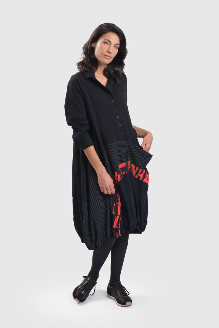 Day-to-dinner versatility, found here! Our most popular dress silhouette combines a soft jersey bodice, sleeves and back with our exclusive techno knit. Styled with collared bodice, princess seams, half-snap front and cuffed long sleeves. Graffiti and pinstripe patterns pop on the pouf skirt, with big draped pocket and hidden elastic in the hem to hold its shape.