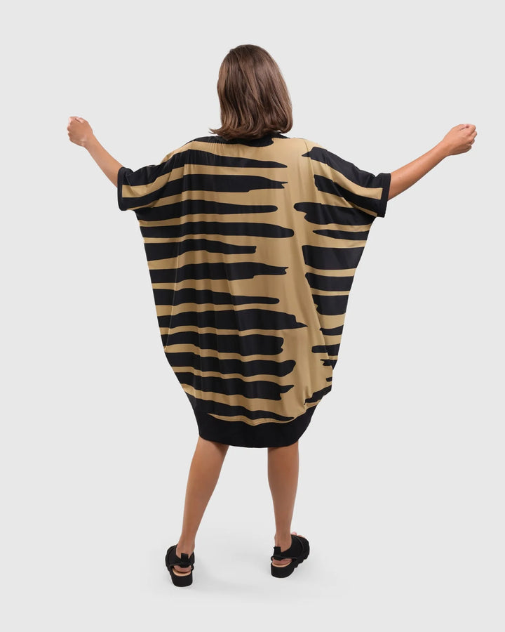 Make a dramatic exit... Our dolman dress is two-faced—in a good way. A substantial t-shirt knit in front, our exclusive techno knit in back, and dolman sleeves offer lots of cool style. Scoop neck, oversized body and chic tapered hem.