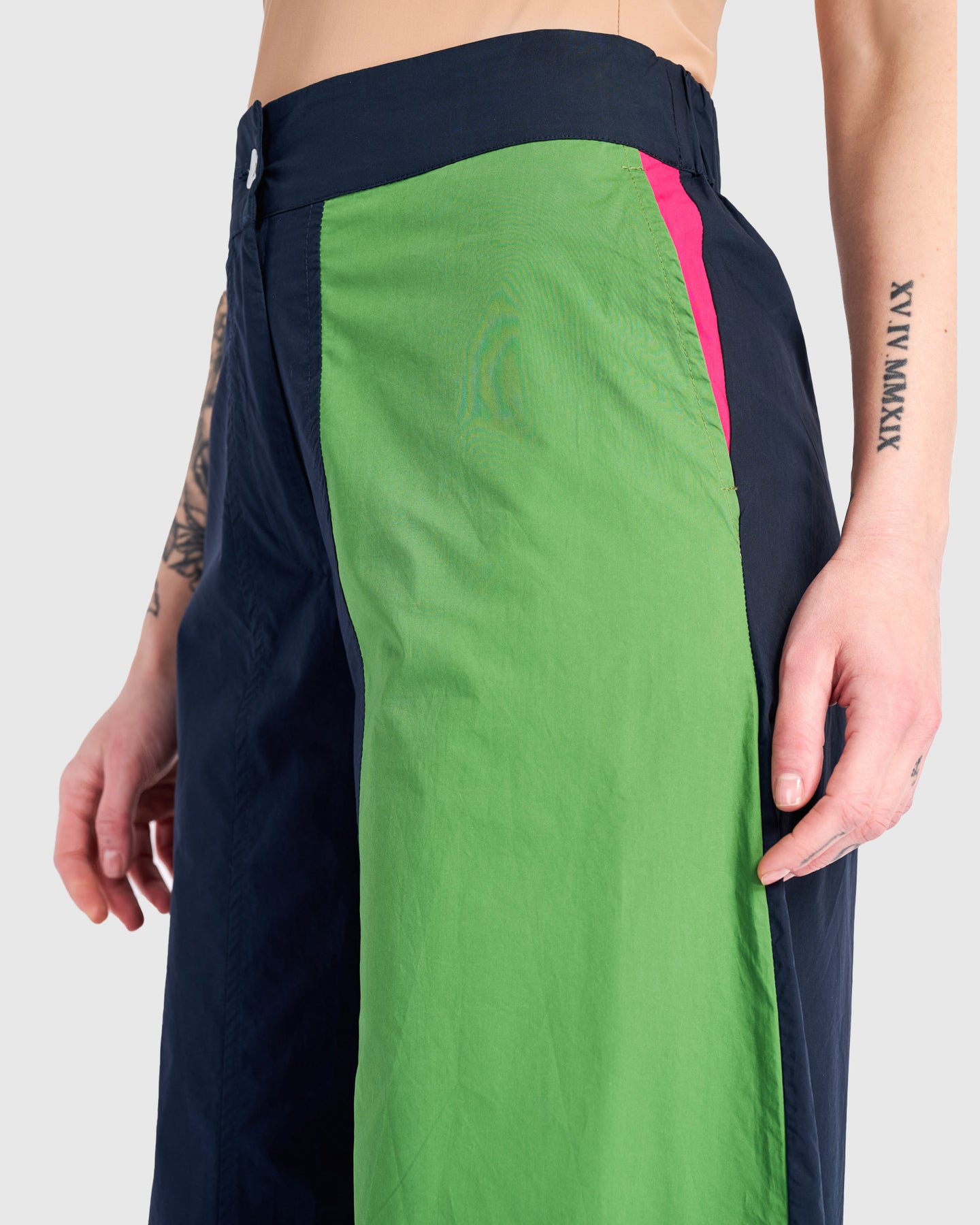 Cut from crisp cotton woven fabric, these high-rise wide leg pants offer a clean line that skims the hips and falls to the ankle. A zipper and button closure with back elastic ensures a comfortable fit. Subtle colorblock detailing, including a hidden pop of color inside the pocket, adds dimension to this polished everyday statement pant.