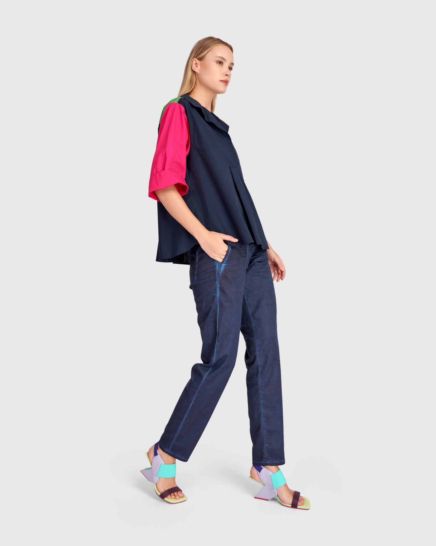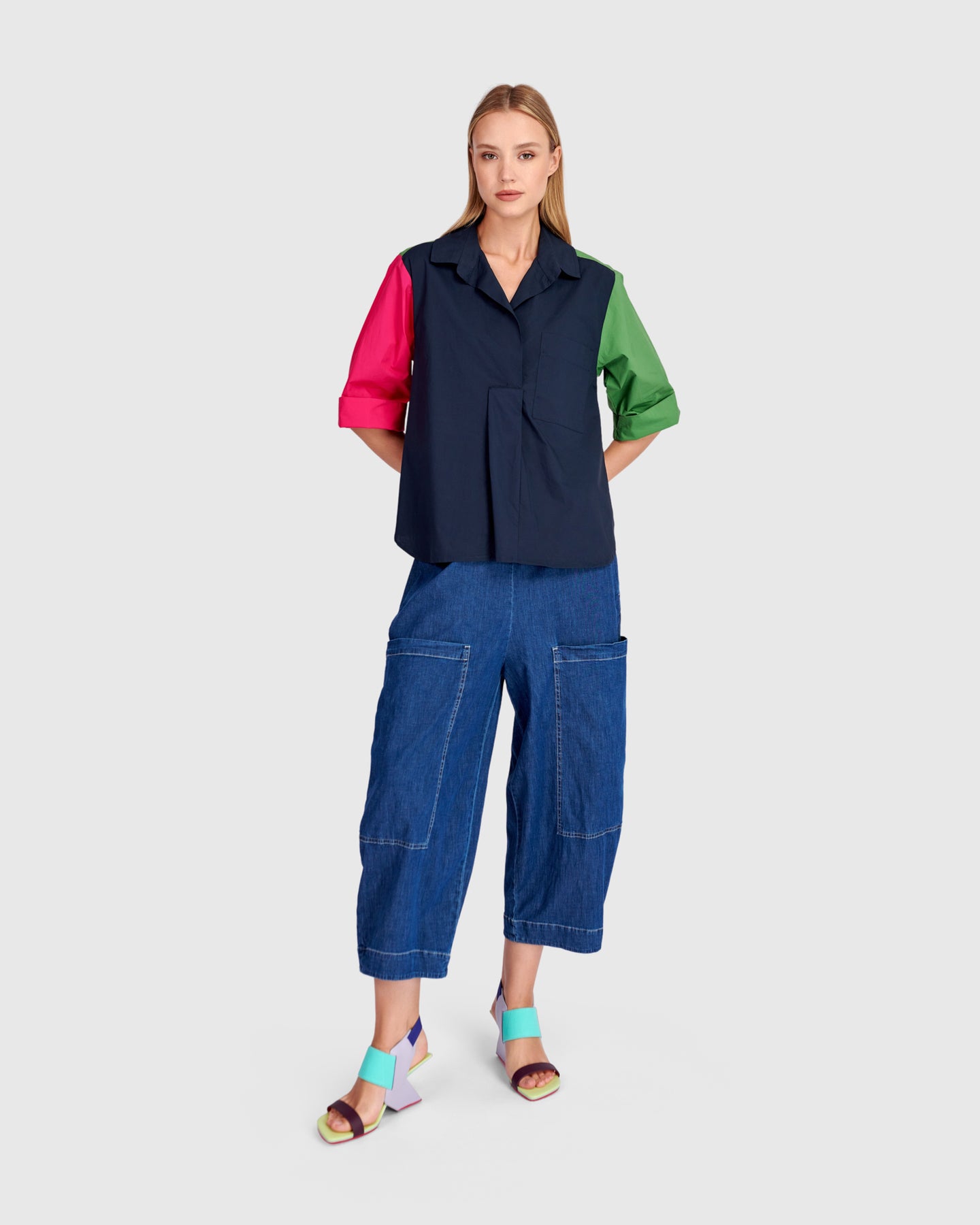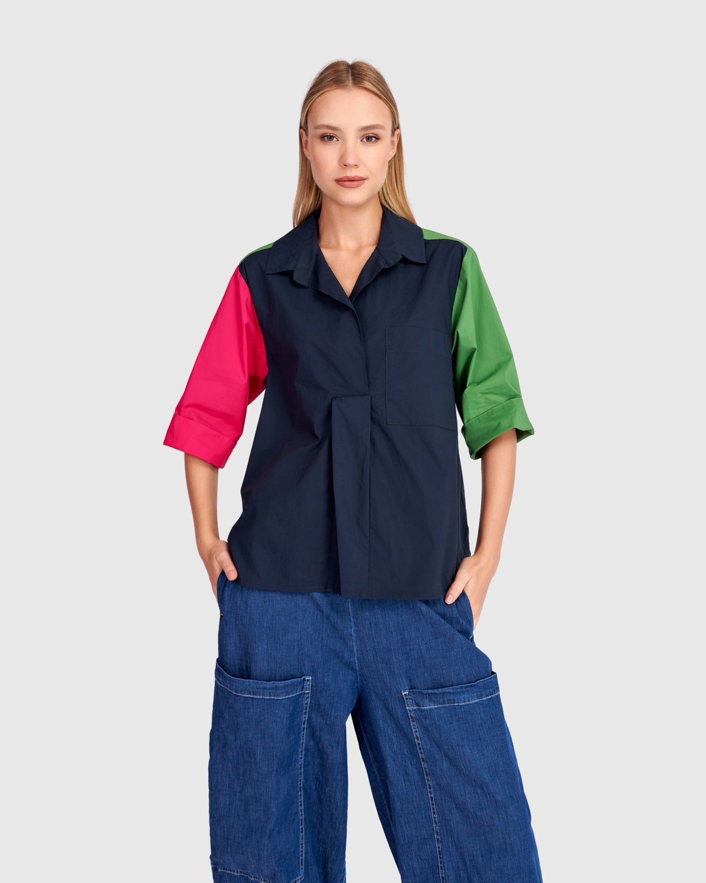 Cut in smooth cotton woven fabric, this hip-length top falls in a relaxed line with a subtle A-line shape. The v-neck with foldover collar sharpens the silhouette, while 3/4 sleeves maintain ease. Crisp pleats and colorblocking create movement and visual depth. Finished with a patch pocket, it is a polished cotton popover with graphic appeal.