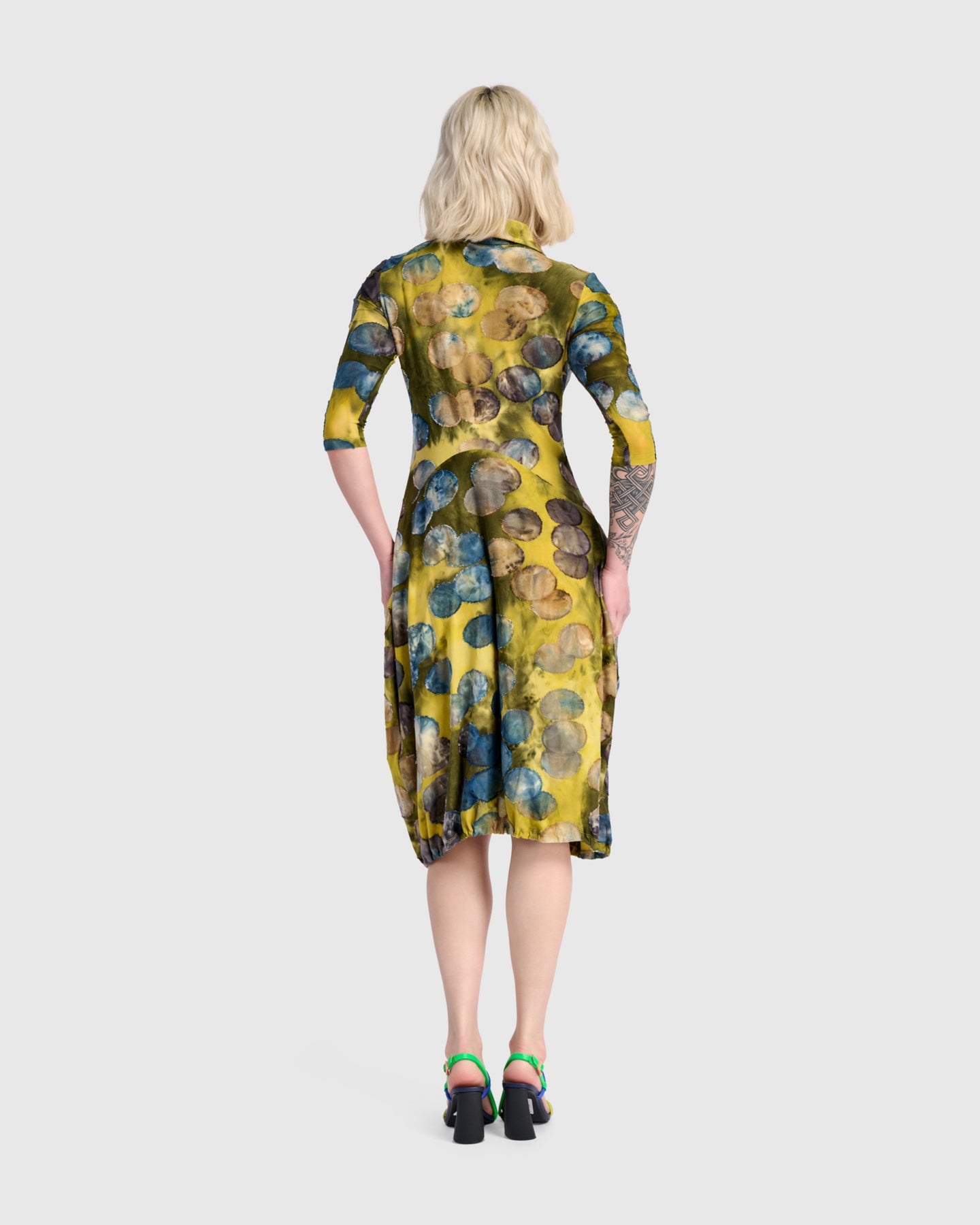This cocoon dress balances ease and polish with a softly contoured shape that moves effortlessly. The featherlight burnout jersey drapes fluidly, while the elasticized hem creates subtle volume and swing. Thoughtful details like draped side pockets and a relaxed button placket add functionality without interrupting the line. An artful printed dress designed for all-day comfort with refined impact.