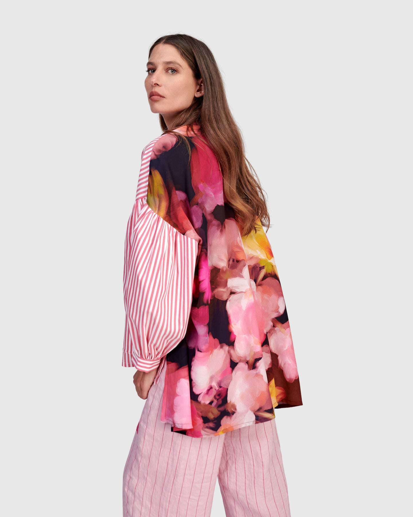 This oversized button-down shirt contrasts a crisp poplin front with a fluid floral back for subtle dimension. The boxy silhouette and drop shoulders create relaxed volume, balanced by puff sleeves with button cuffs. A collarless neckline keeps the shape clean and modern. An elevated printed blouse that pairs easily with wide leg or straight pants.
