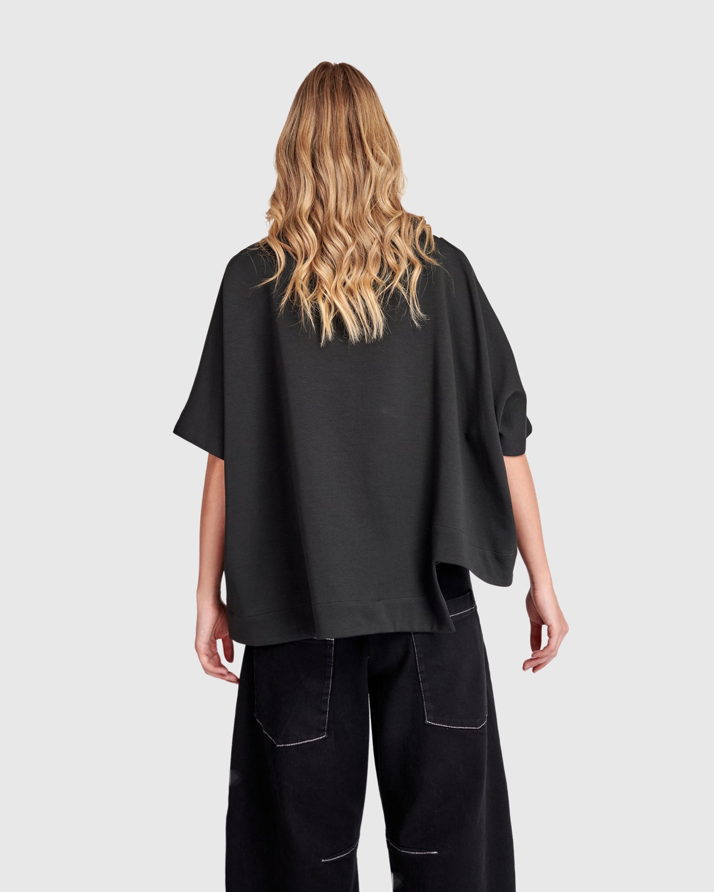 This boxy top is cut with a signature side cutout that creates a sharp, graphic line through the hem. The midweight cotton jersey has comfortable stretch and a smooth hand, designed to move with you without losing shape. An easy oversized top that elevates everyday black.