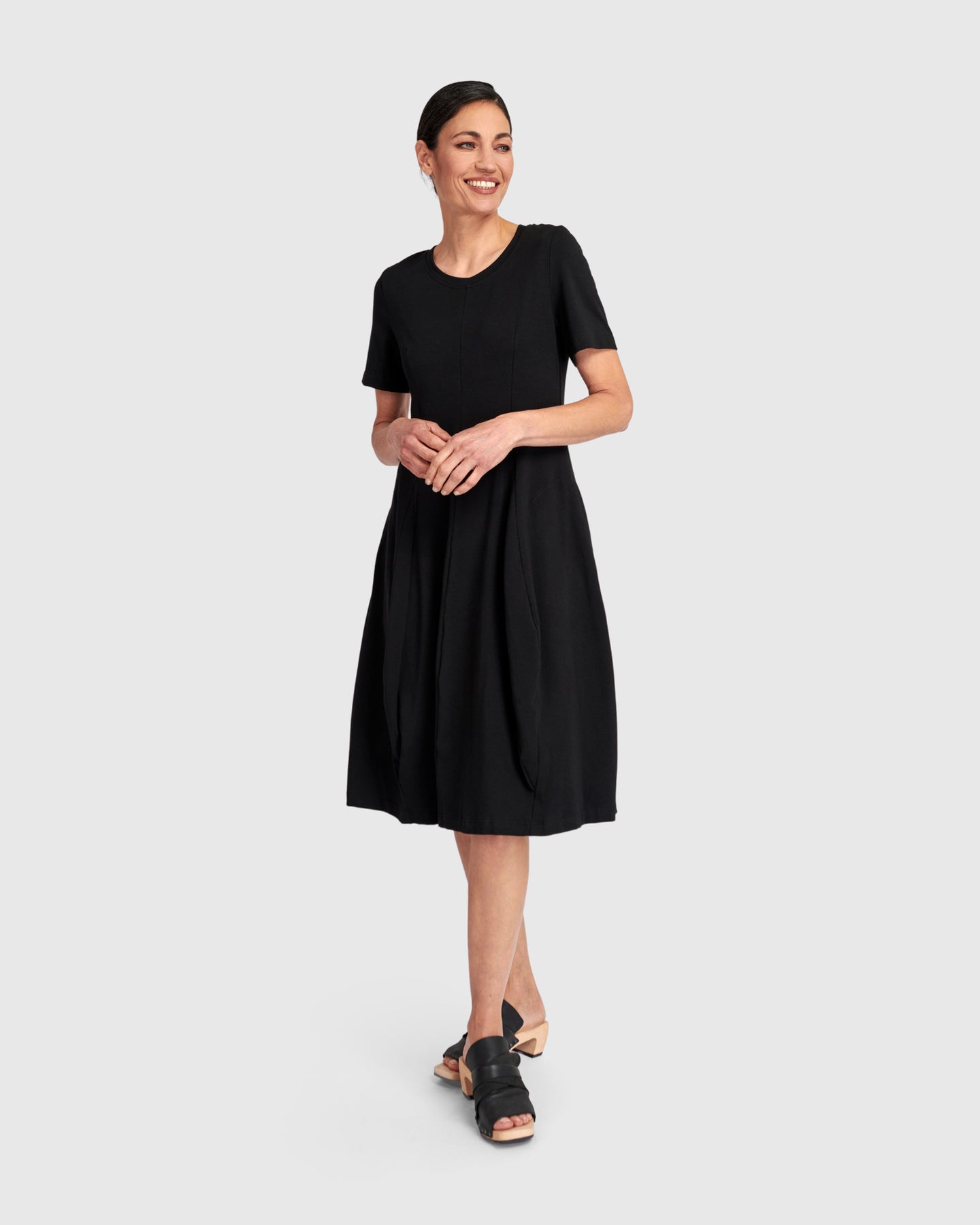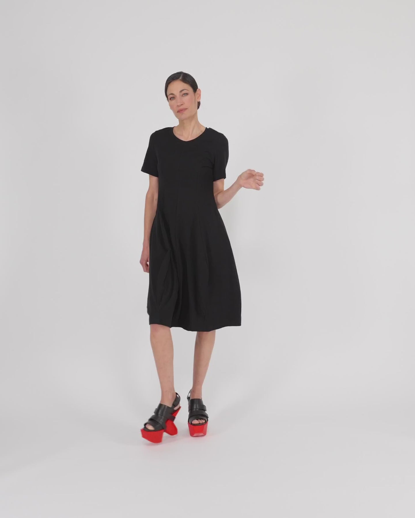 This knee-length cocoon dress offers a streamlined fit through the bust with relaxed shaping through the skirt. The lightweight cotton jersey provides comfortable stretch and everyday ease, while fitted sleeves and a clean crew neckline keep the look simple and versatile. Finished with side pockets, it's a casual staple with polished proportions.