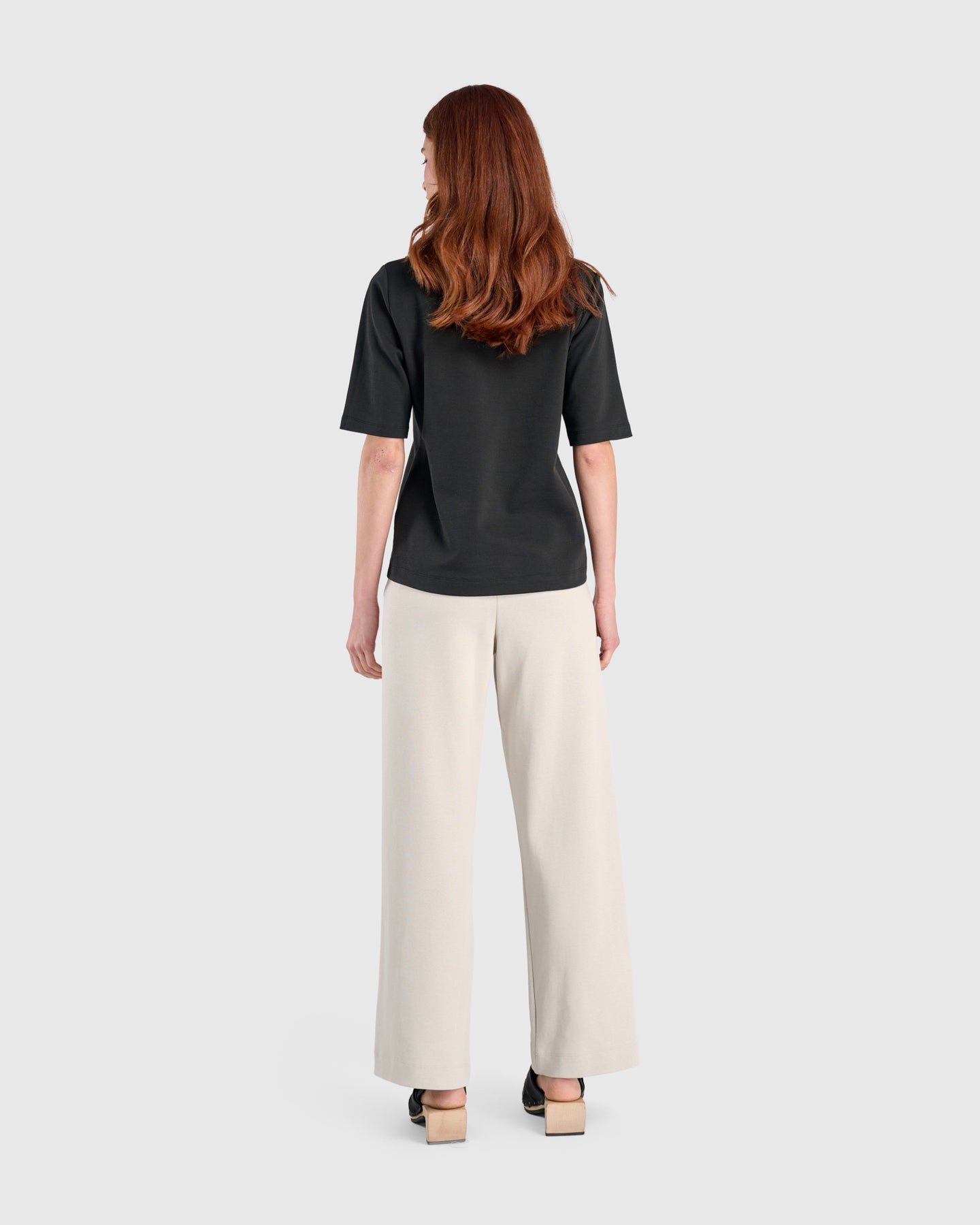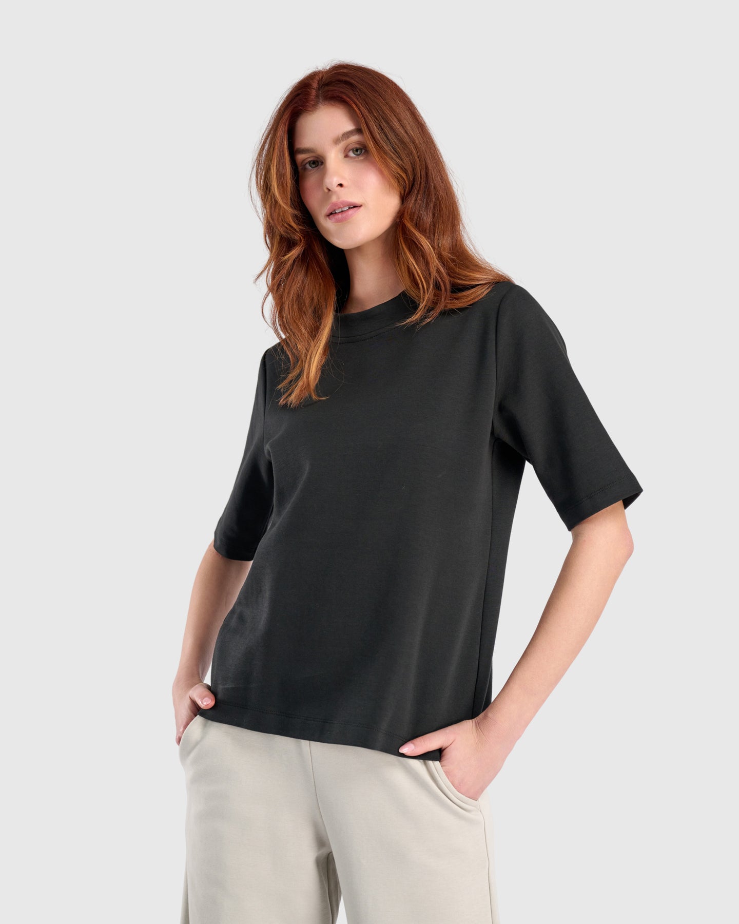 This fitted black tee is designed with clean lines and a smooth, supportive cotton jersey. Cut closer through the shoulders and body, it offers a polished take on a classic t-shirt. A raised crew neckline and longer sleeves refine the silhouette, making it an easy essential that works equally well layered or worn on its own.