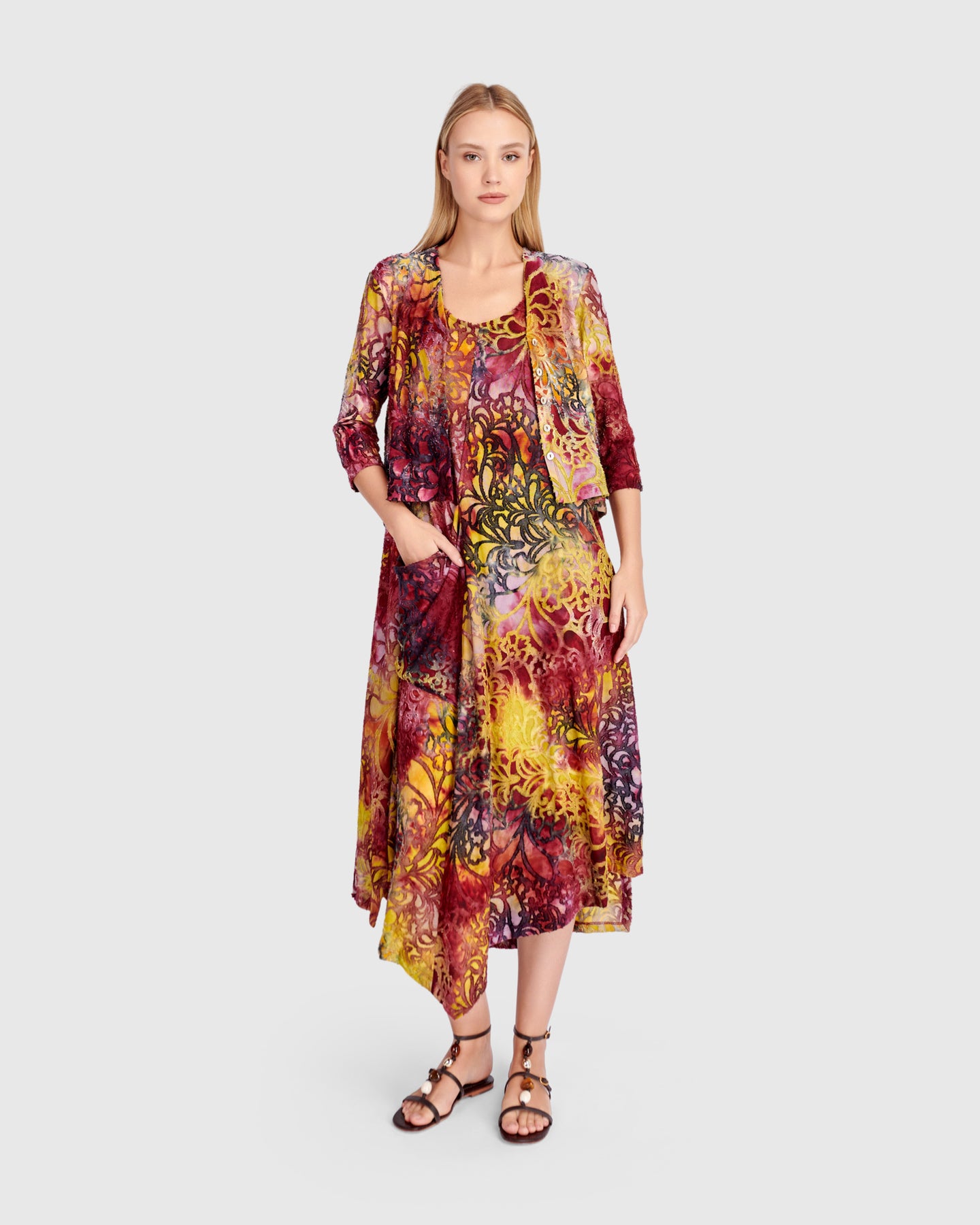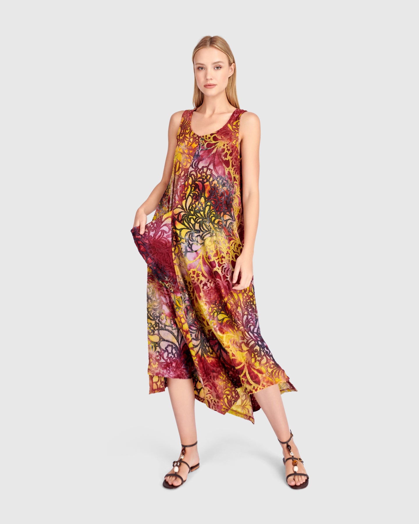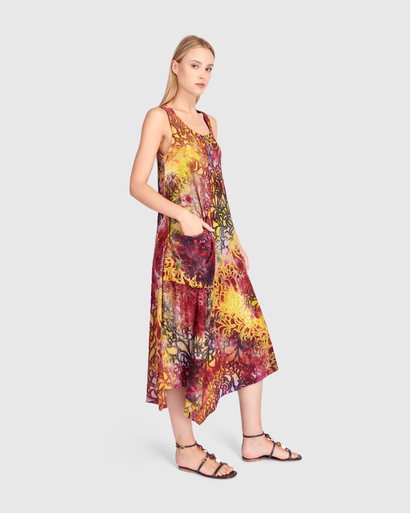 Cut in airy burnout jersey, this sleeveless maxi dress falls in a relaxed A-line from bust to hem. The lightweight knit drapes fluidly, while an asymmetrical hem enhances movement. A scoop neckline keeps the shape clean, and the signature draped front pocket adds dimension. An effortless printed maxi dress designed for warm days and easy layering.
