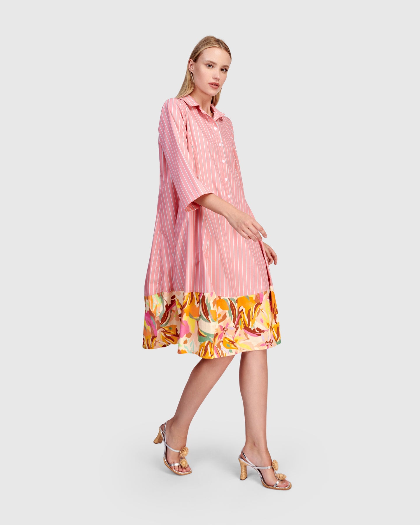 Crafted in smooth cotton poplin, this cocoon dress balances volume with shape. The fit relaxes through the shoulders and bust before tapering at the waist into generous skirting. A foldover collar and half button placket add polish, while mixed stripes and florals bring graphic energy. Finished with side pockets, this below-the-knee midi dress offers breathable comfort and everyday versatility.
