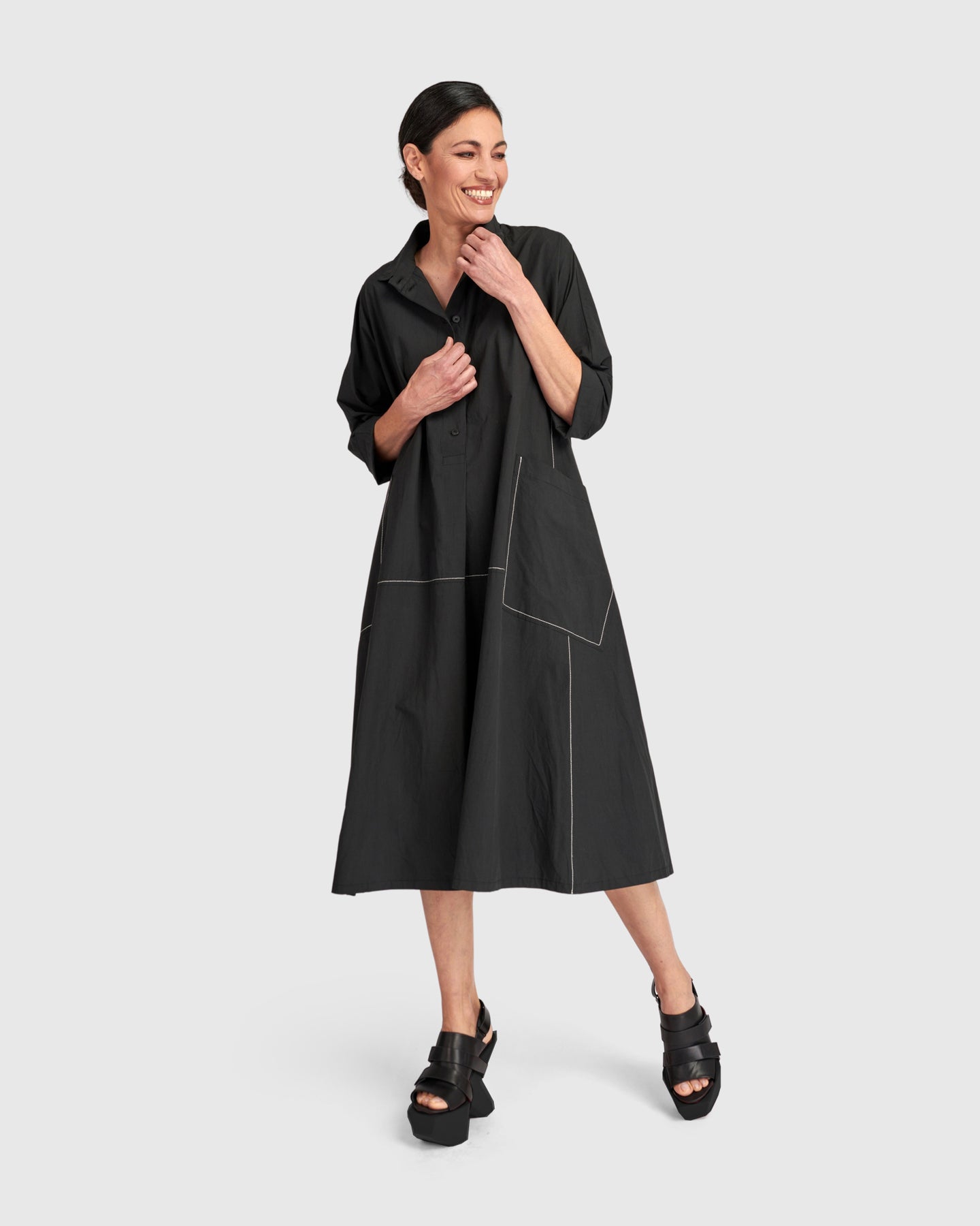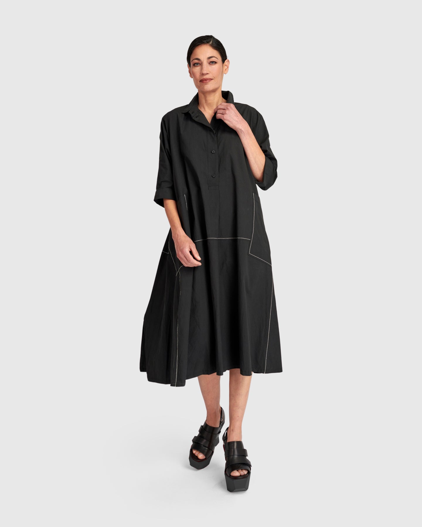 This cotton dress is cut with generous volume for an easy A-line shape that feels relaxed yet intentional. The washed cotton fabric softens the silhouette, while subtle gathering at the back adds movement. Oversized pockets and a casual button placket complete a versatile everyday dress with modern ease.
