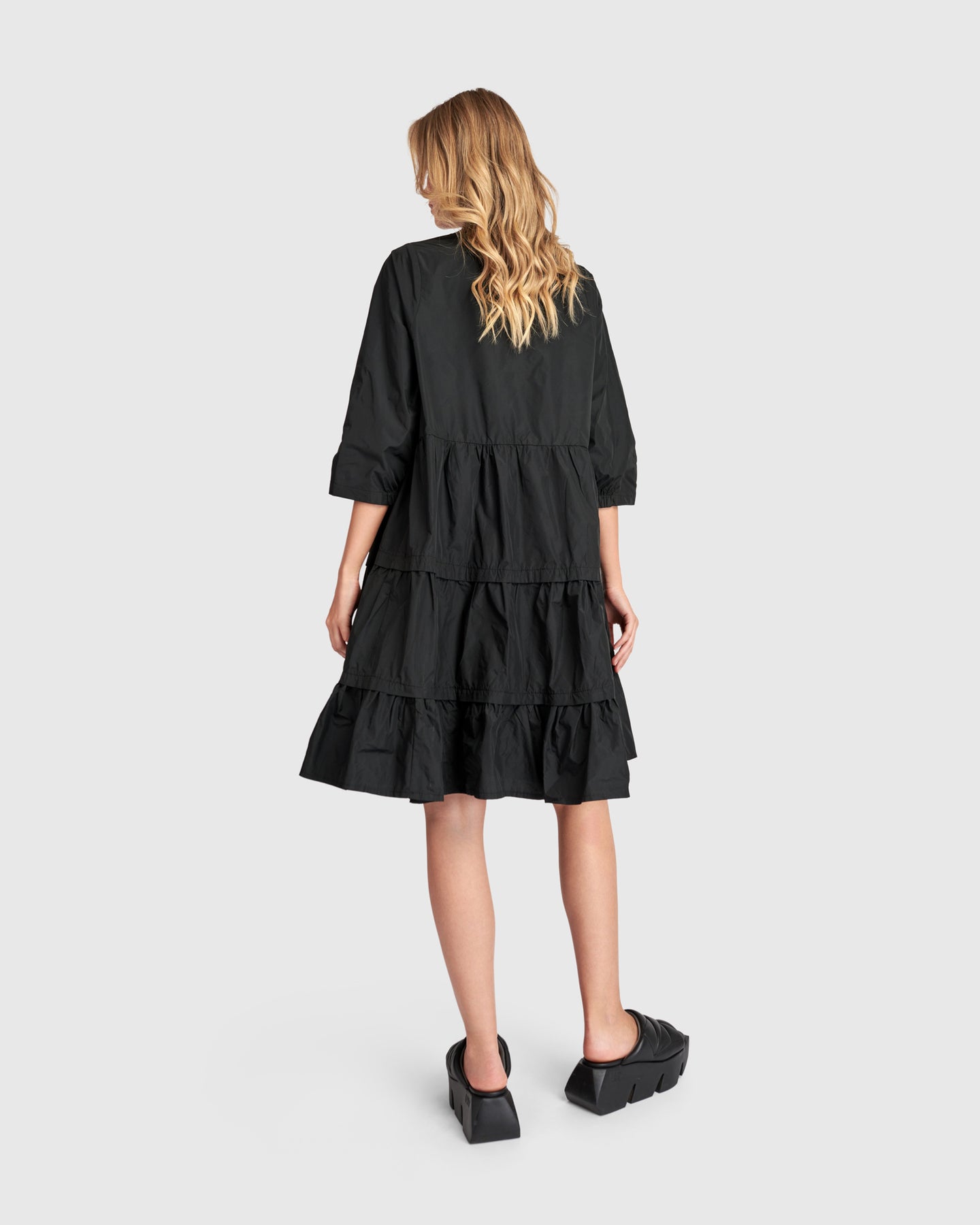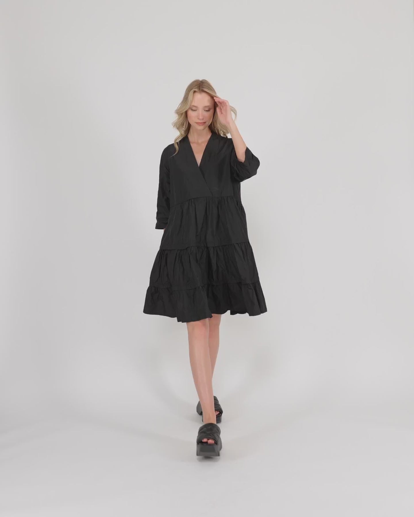 Cut in swishy woven taffeta, this black mini dress delivers light volume with a tiered skirt that moves cleanly as you walk. The relaxed A-line shape falls away from the body for easy comfort, while the overlapping V-neck adds a crisp finish. Wear it as a tunic over slim pants or as a standalone pocket-free statement dress.
