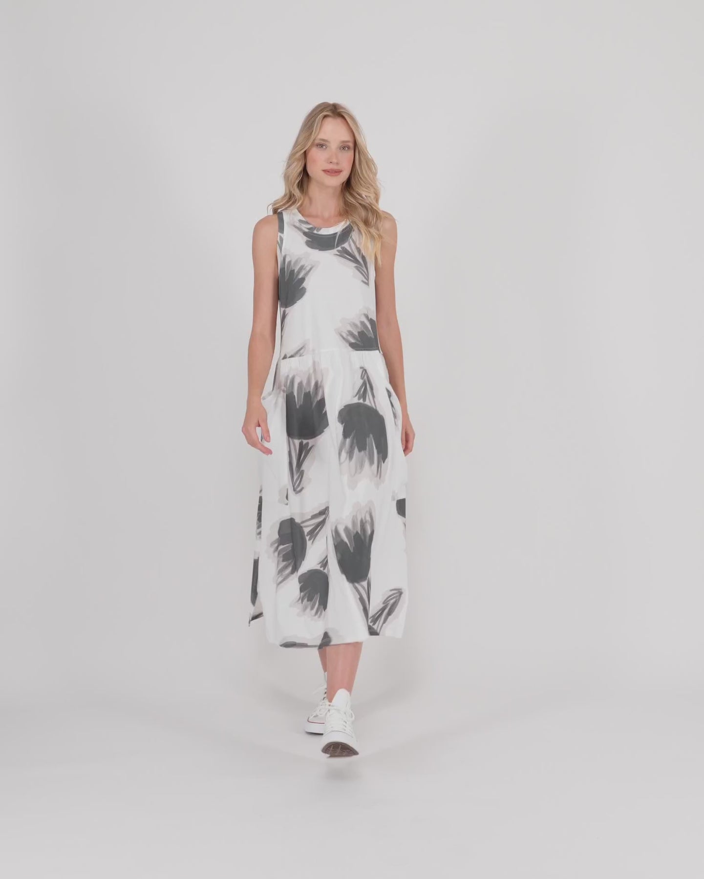 This printed sleeveless dress is cut with a gentle A-line shape that skims the upper body before easing through the skirt. Soft cotton jersey keeps it breathable and comfortable, while large patch pockets add everyday utility. Finished with side slits for movement, it's an easy pull-on style designed for relaxed, off-duty days.