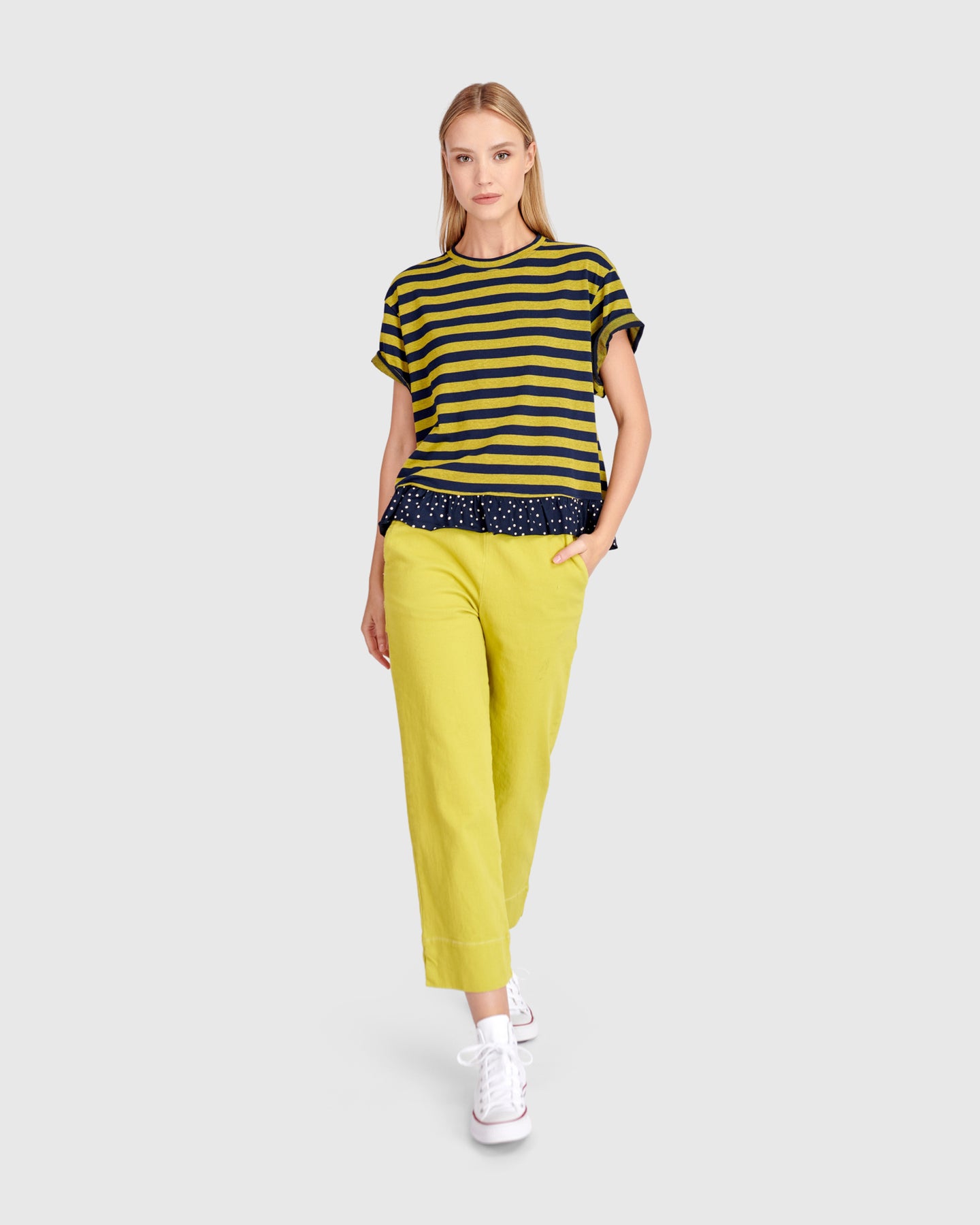 Designed in a soft T-shirt knit, this relaxed top combines everyday comfort with graphic detail. The boxy silhouette and crew neck keep the shape classic, while a contrast print ruffle with raw edge adds movement at the hem. An easy cotton blend tee that brings playful dimension to modern casual dressing.