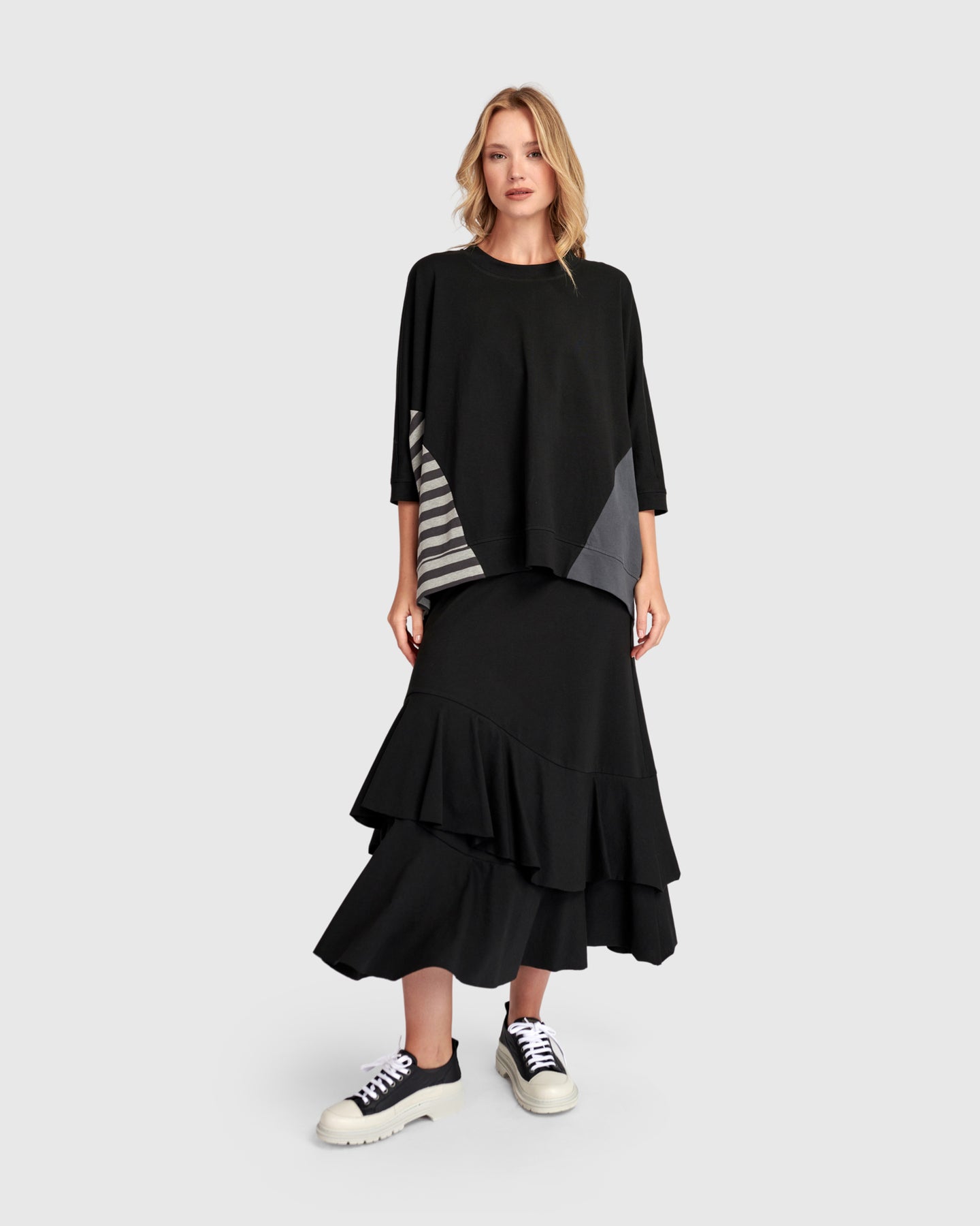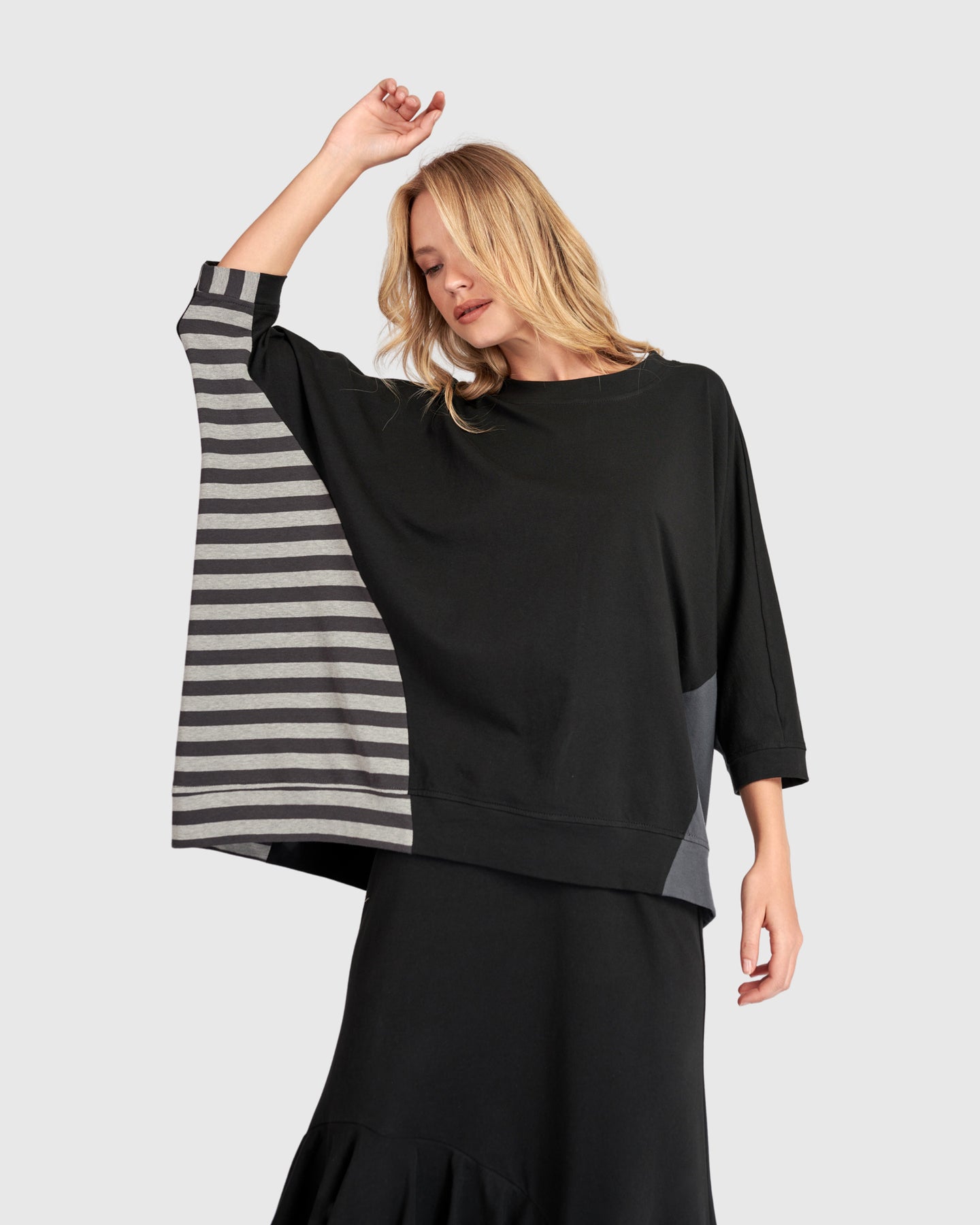This oversized tunic is defined by a softly rounded shape that drapes fluidly over the body. Crafted from breathable cotton jersey, it offers comfort without feeling heavy. The extended length adds coverage, while dolman sleeves enhance ease through the shoulders. A versatile black top designed for relaxed, everyday wear with modern proportion.
