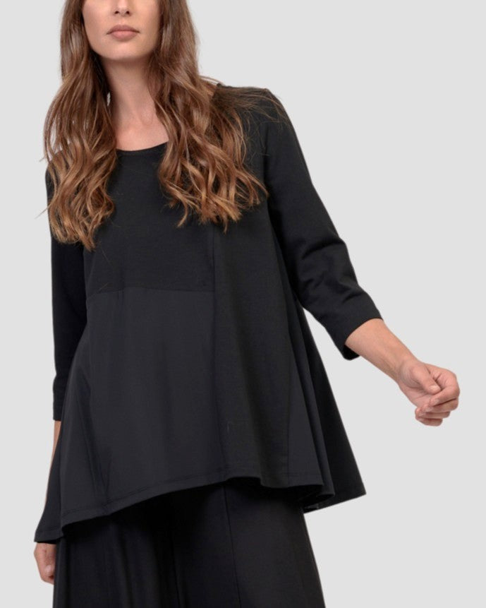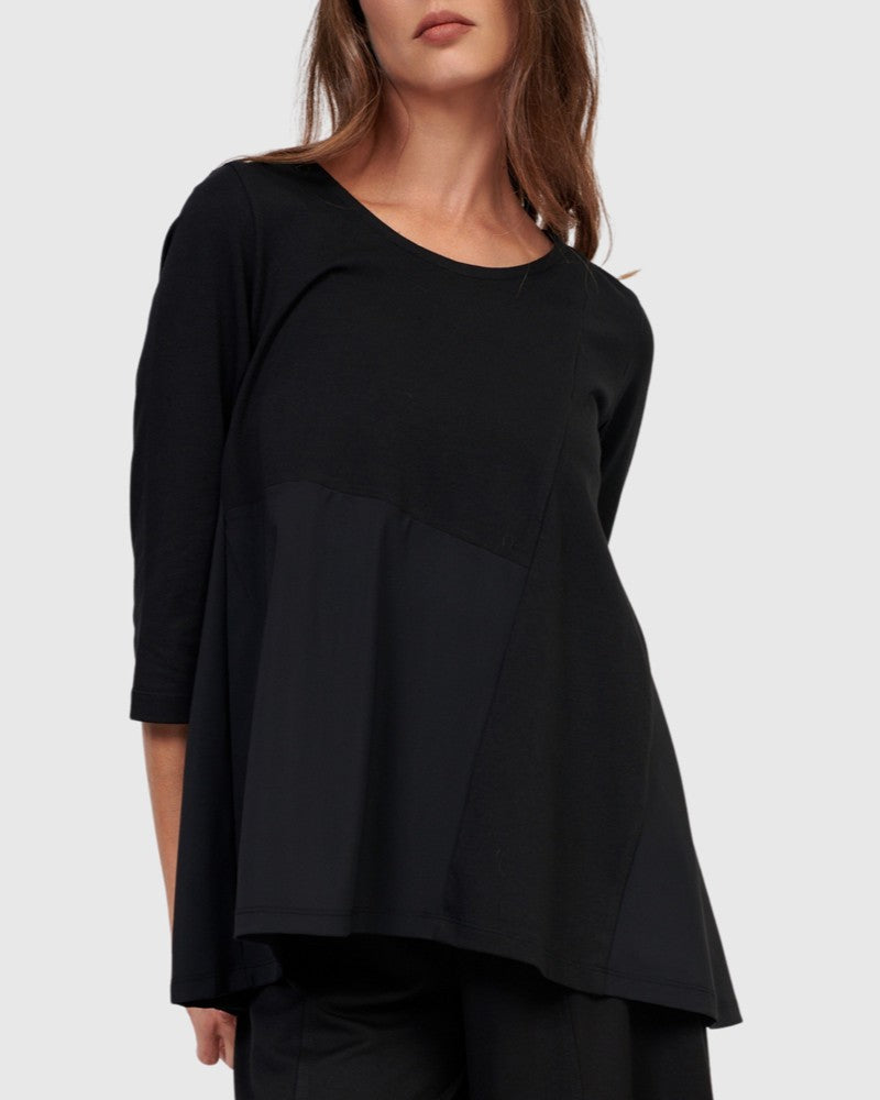 The Essential Slinky Point Hem Top in Black skims the body with a soft A-line shape, cut to flatter and move with ease. The hem dips to asymmetrical points with subtle side slits for flow, while the jersey knit drapes comfortably over the shoulders and arms. A versatile silhouette with a distinctive finish.