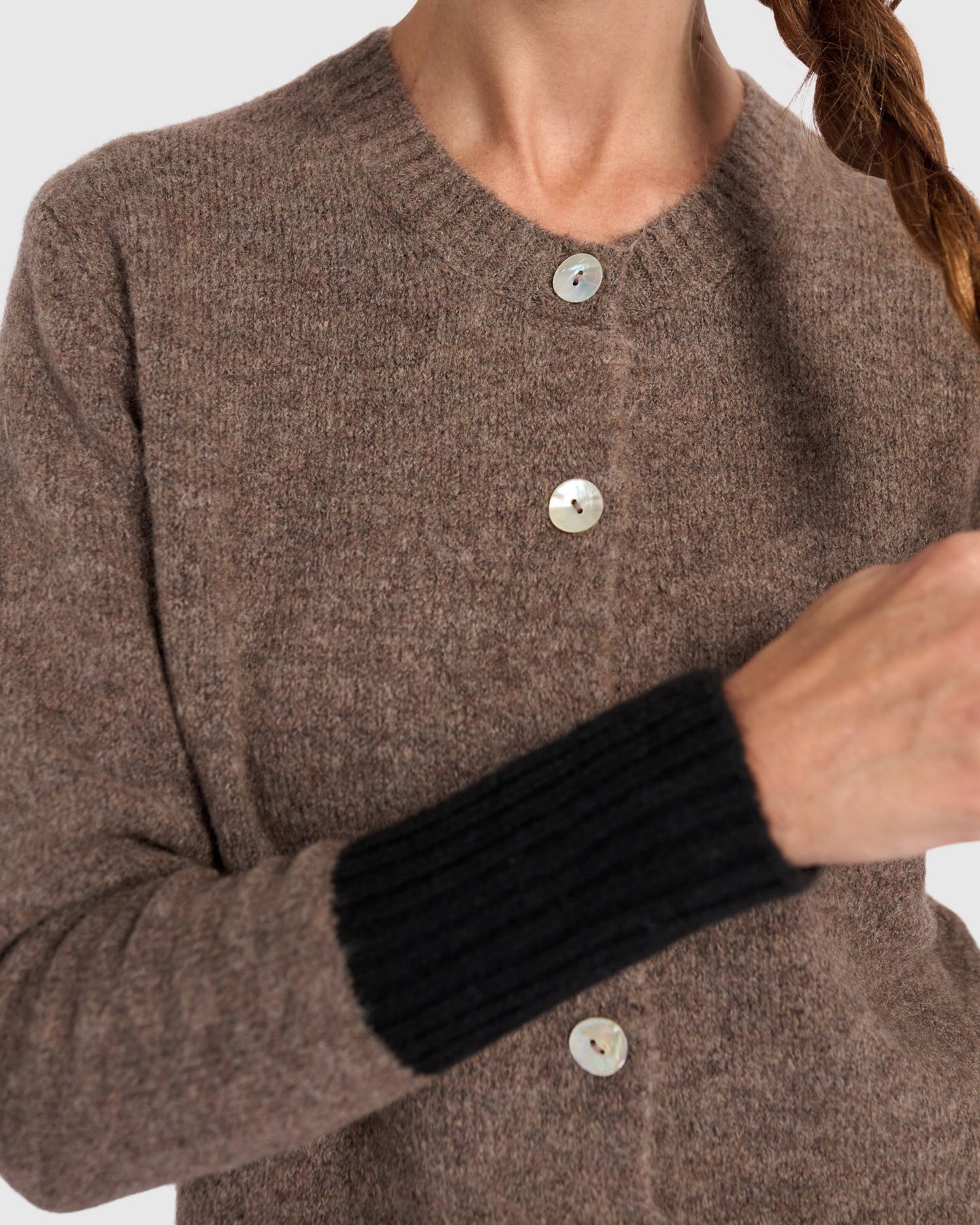 The Blackbird Sweater is a modern classic, offering a sleek cropped shape with softly fuzzy texture. Tailored with a straight silhouette and full-length sleeves, it's finished with colorblock ribbed details and shell buttons for a polished yet playful look.