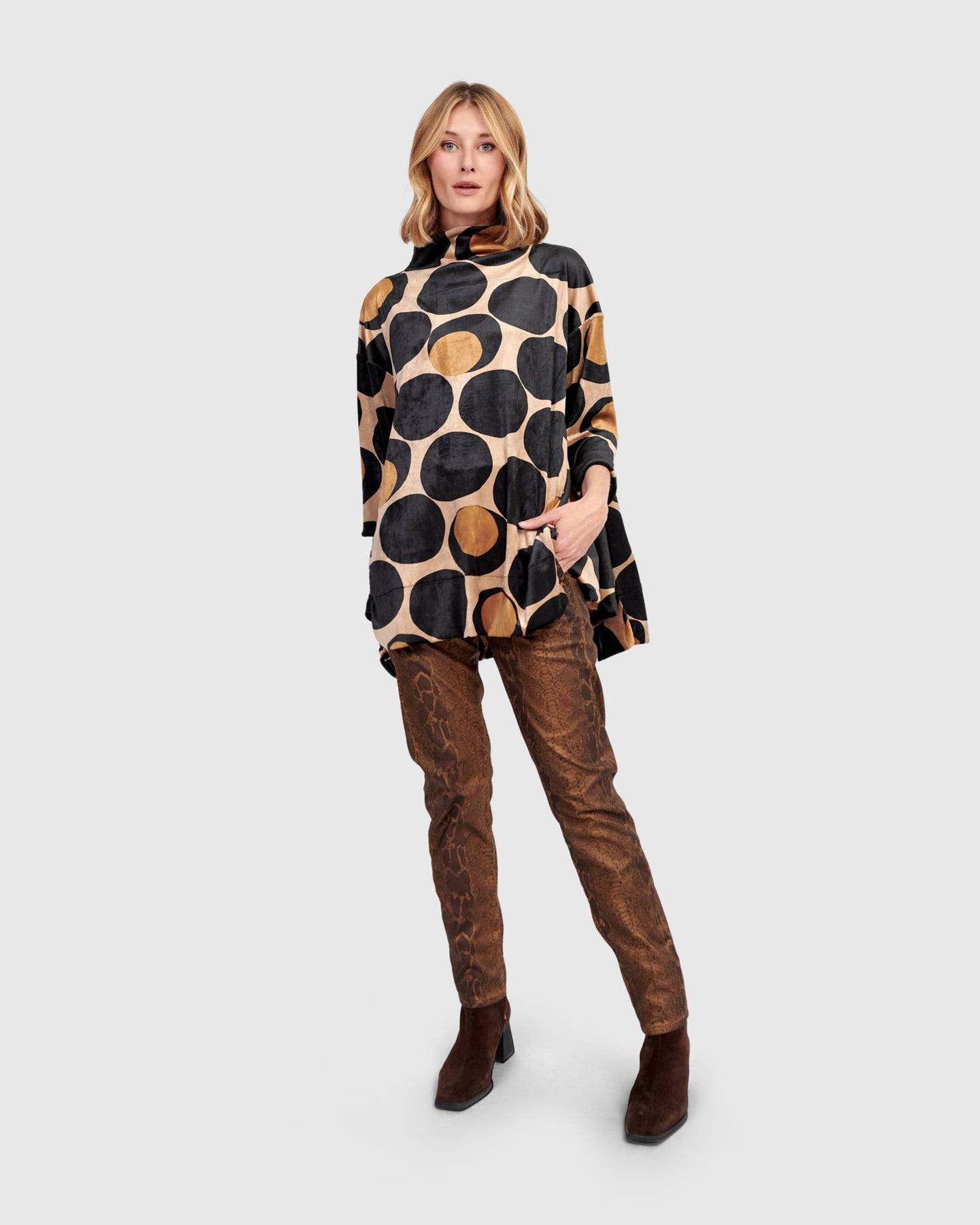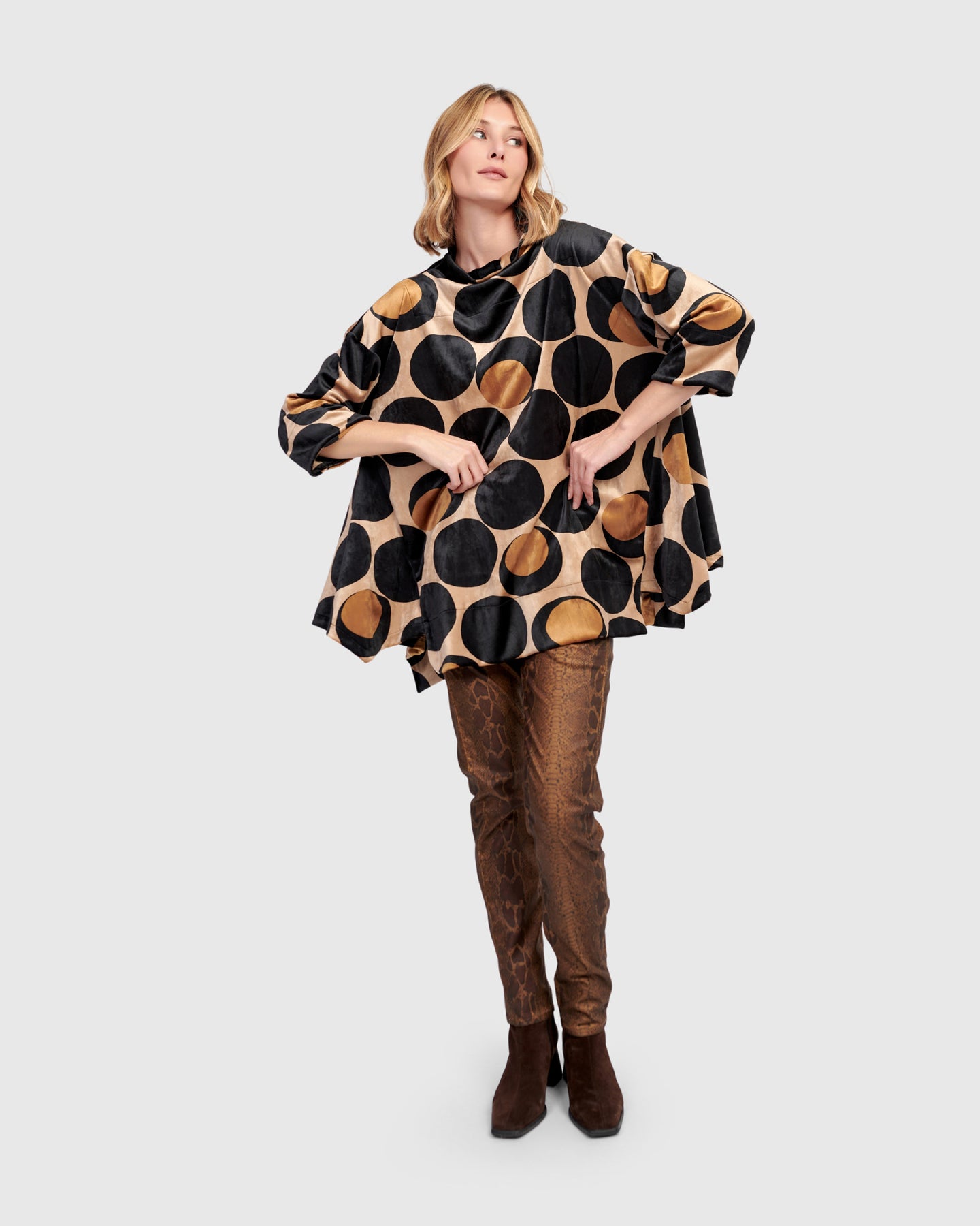 Designed in luxurious stretch velvet, this oversized trapeze top features a sweeping silhouette with fluid drape. The handkerchief hem and funnel neckline add sculptural volume, while the 3/4 sleeves provide ease. A standout tunic for both casual and festive dressing.