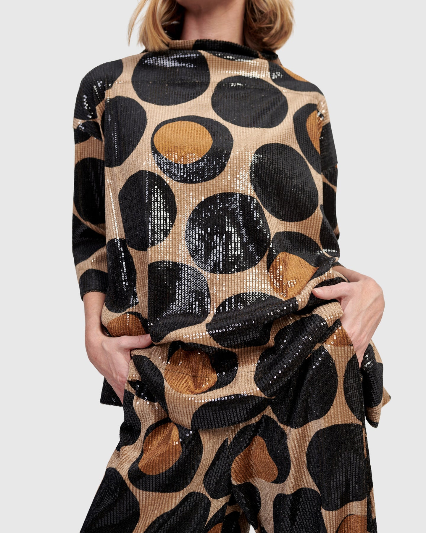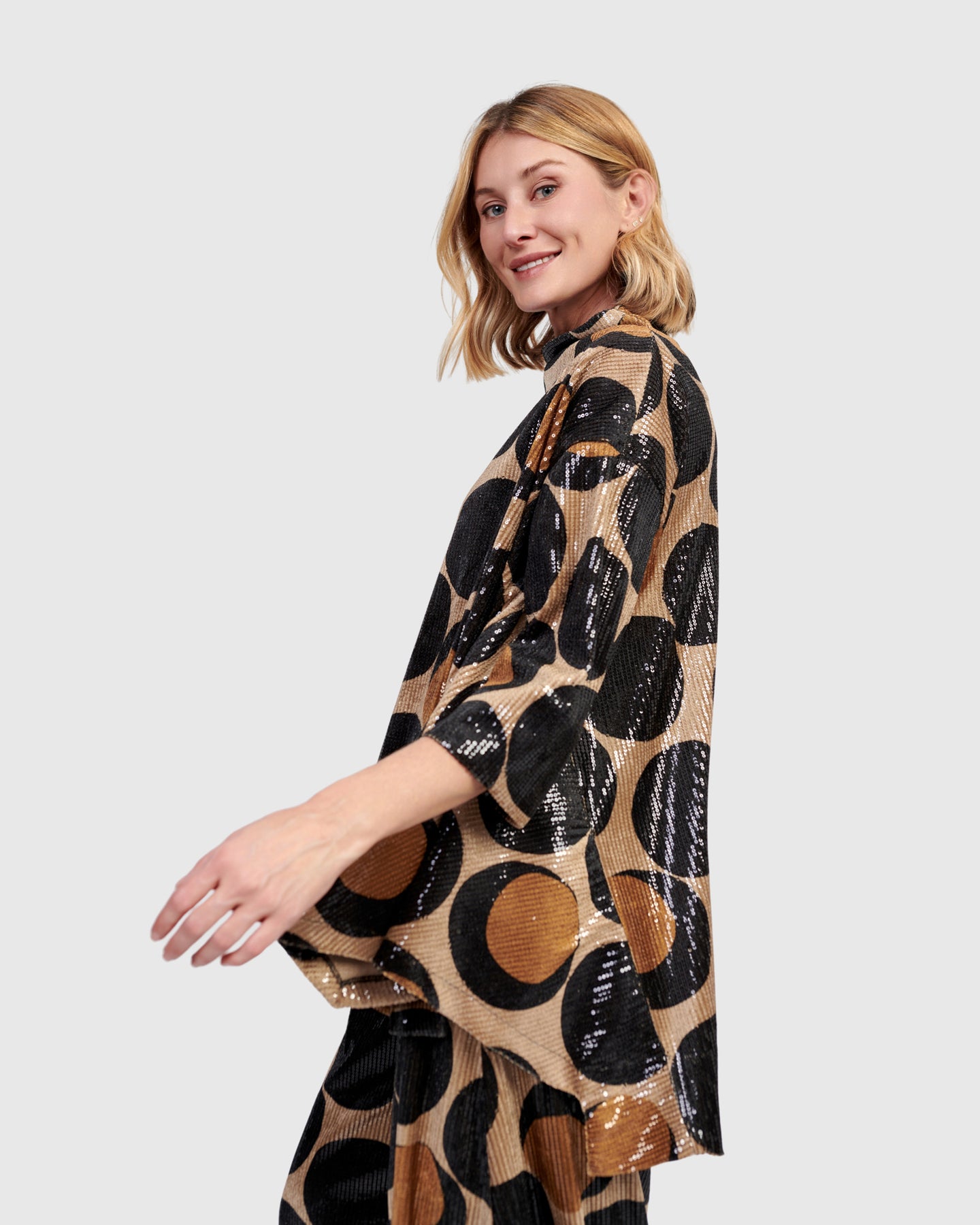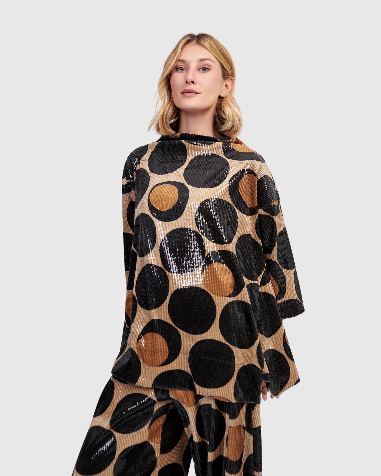 This sequin-studded tunic delivers shine with ease in a fluid, oversized cut. The trapeze silhouette floats away from the body, while the handkerchief hem adds graceful movement. Finished with a funnel neckline and 3/4 sleeves, it's an effortless statement for day or night.