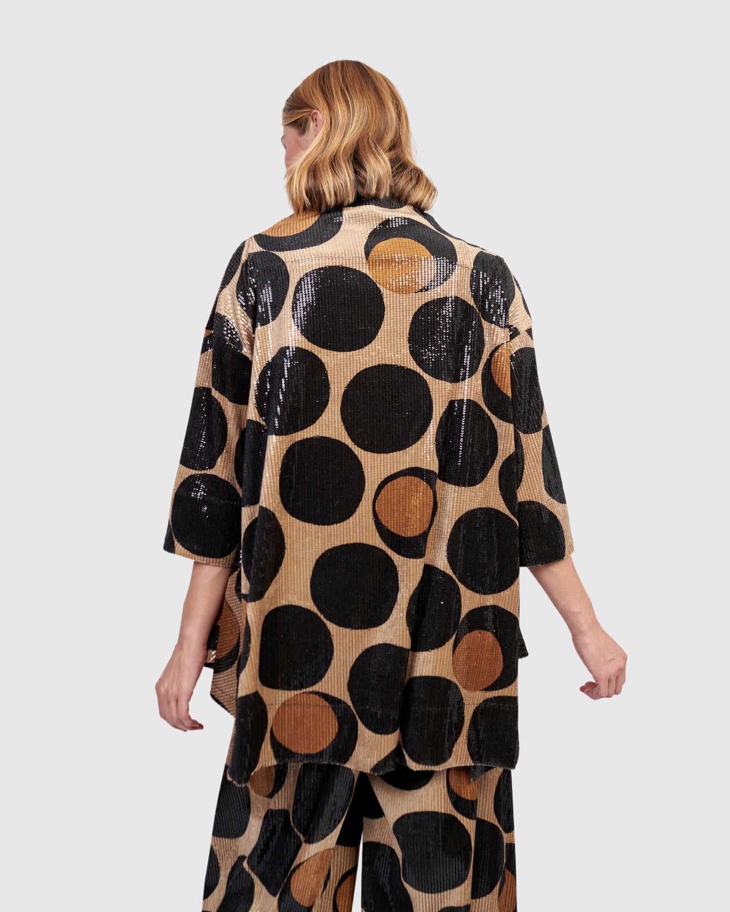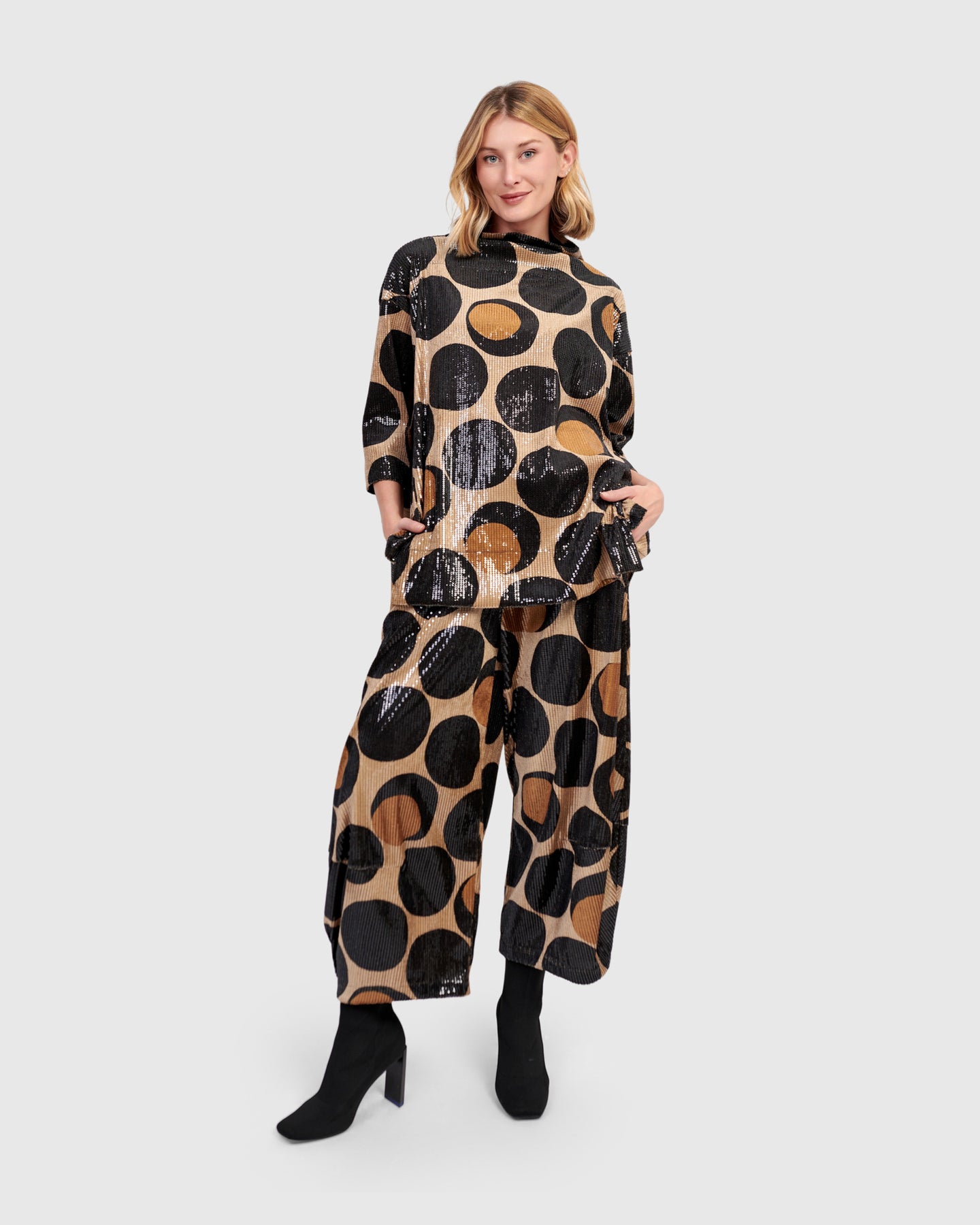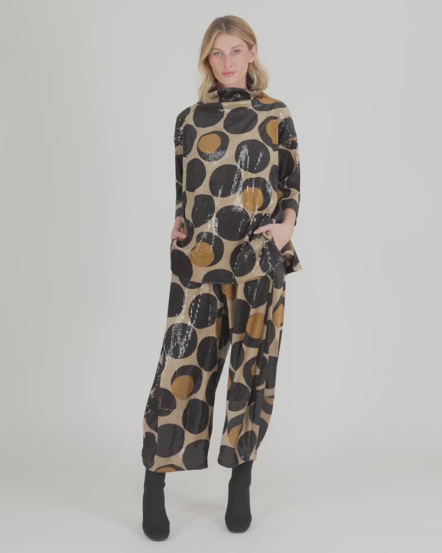 This sequin-studded tunic delivers shine with ease in a fluid, oversized cut. The trapeze silhouette floats away from the body, while the handkerchief hem adds graceful movement. Finished with a funnel neckline and 3/4 sleeves, it's an effortless statement for day or night.