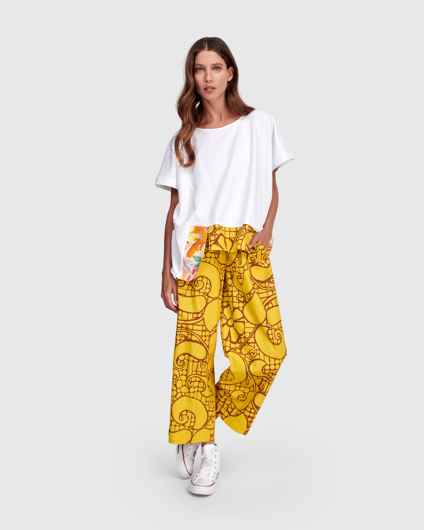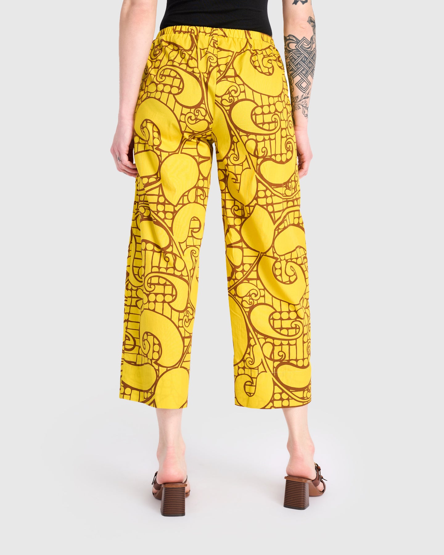 Designed in lightweight cotton woven fabric, these cropped straight leg pants offer breathable comfort with a relaxed fit through the leg. The mid-rise elastic waistband provides ease and flexibility, while side pockets add practicality. A bold yellow print brings graphic energy, making this an easy statement pant for everyday wear.