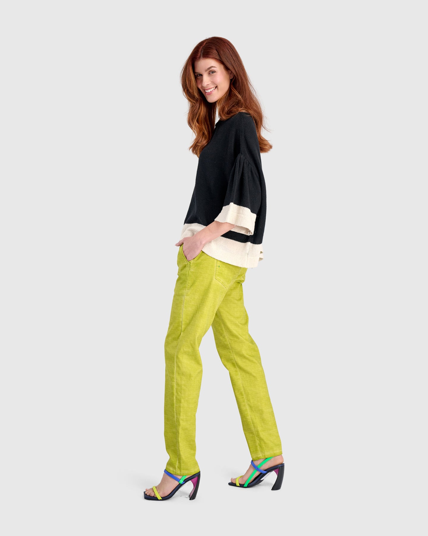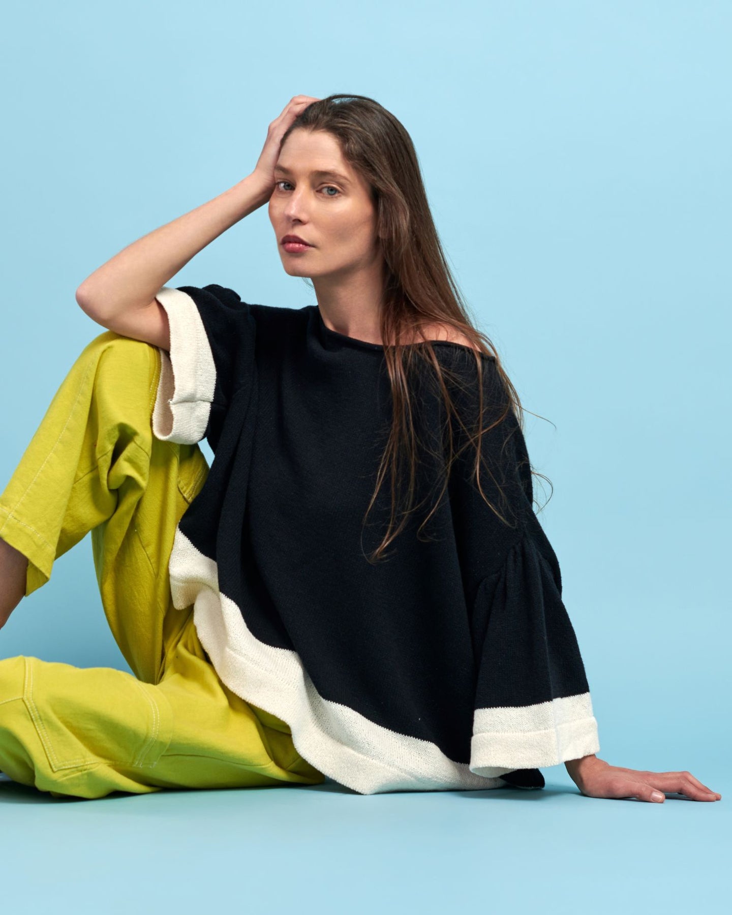 Relaxed and feminine, this oversized sweater features softly draped bell sleeves and a subtly cropped shape. The breathable open knit in black and cream delivers easy elegance, while the rolled neckline and drop shoulders keep the look effortless. A versatile option for refined comfort.
