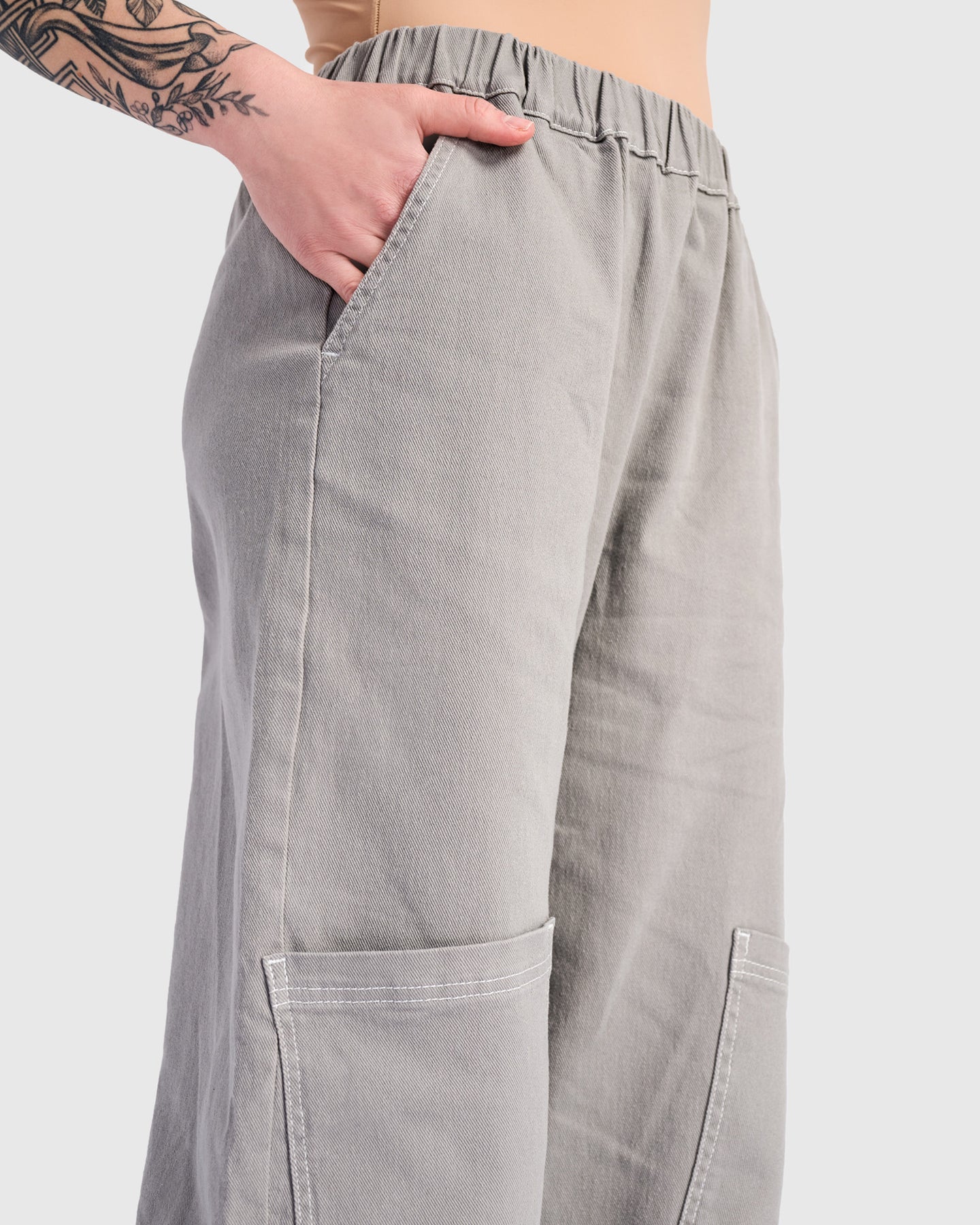 With a soft barrel shape and relaxed leg, these full-length pants blend casual comfort with a refined silhouette. The high-rise stretch waist sits flat for a clean look, while subtle knee patches and side pockets add utility without bulk. Lightweight twill with a touch of stretch makes them perfect for day-long wear.
