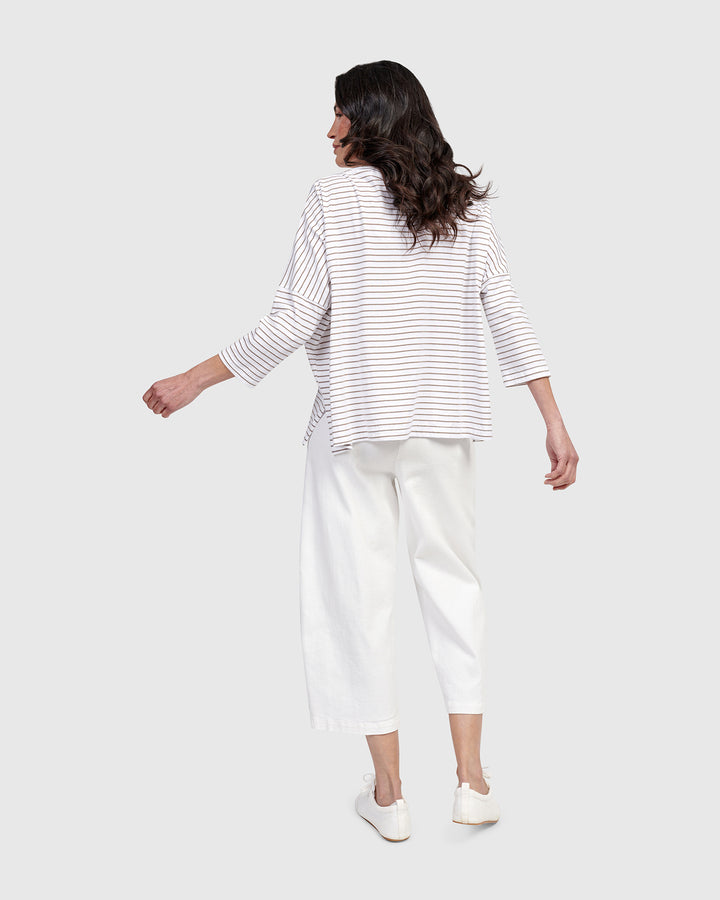 This oversized pullover top is made in a soft tee knit and has a rolled wide neck, drop-shoulder three-quarter length sleeves, front pocket and boxy, hip-length silhouette.