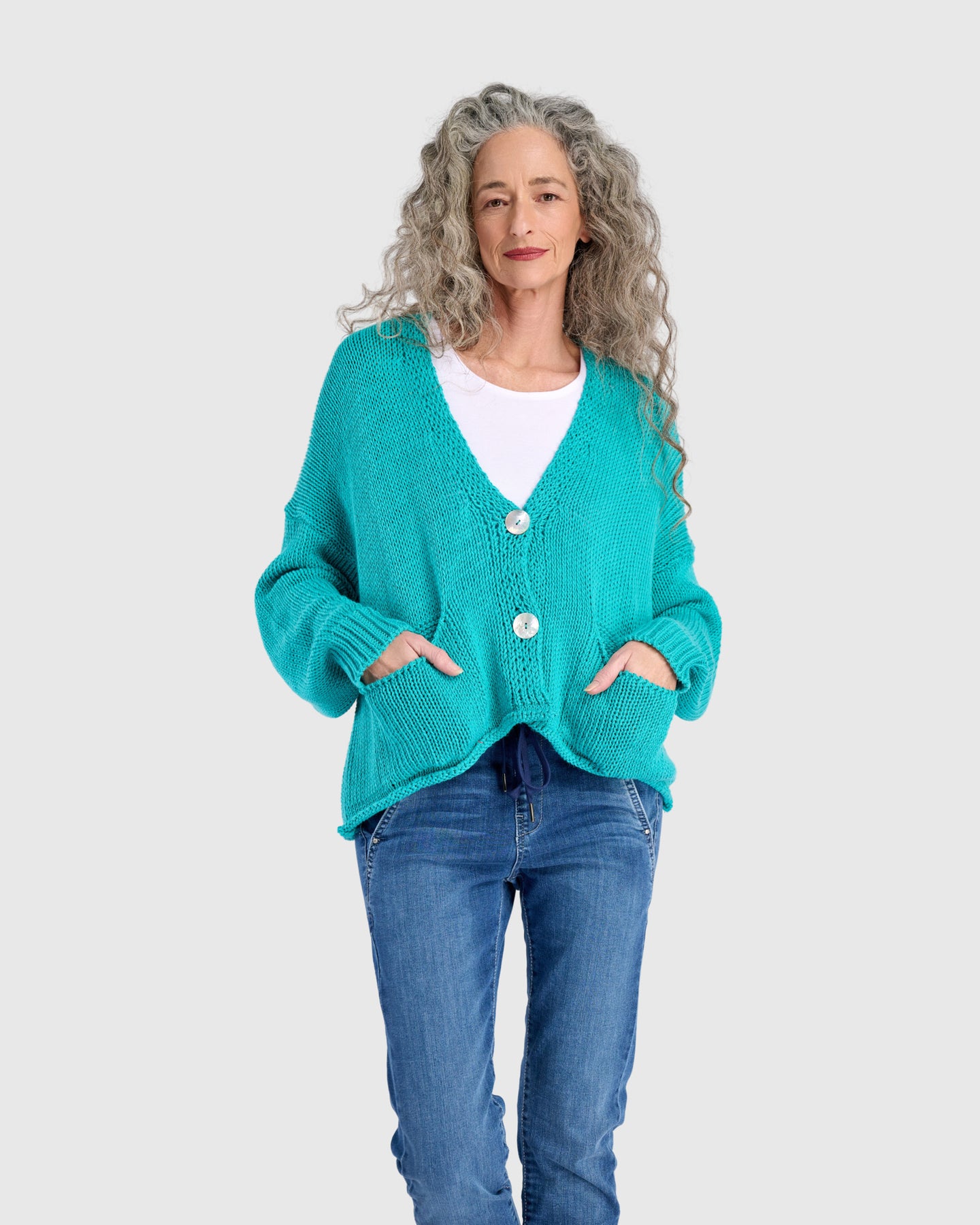 Rendered in vibrant turquoise, this slouchy cardigan brings a burst of brightness to everyday layering. The breathable chunky knit drapes in a loose boxy shape that flatters without clinging. Designed with oversized buttons, patch pockets, and relaxed sleeves, it's a versatile favorite for laid-back polish.