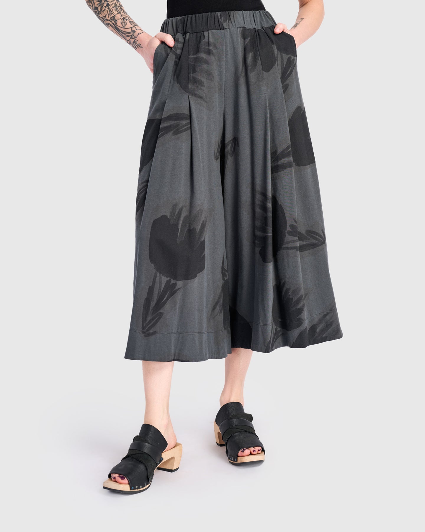 Cut in breathable cotton jersey, this high-rise palazzo pant offers generous volume through the cropped leg. The loose silhouette drapes easily from hip to hem, while front pleats add subtle shape. Finished with an elastic waistband and side pockets, this printed knit pant balances comfort with a clean, modern line.